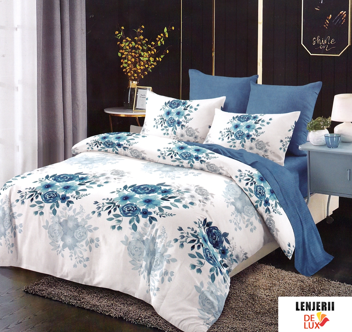1+1 Gratis Lenjerie de pat din finet alba cu flori albastre formata din 6 piese
