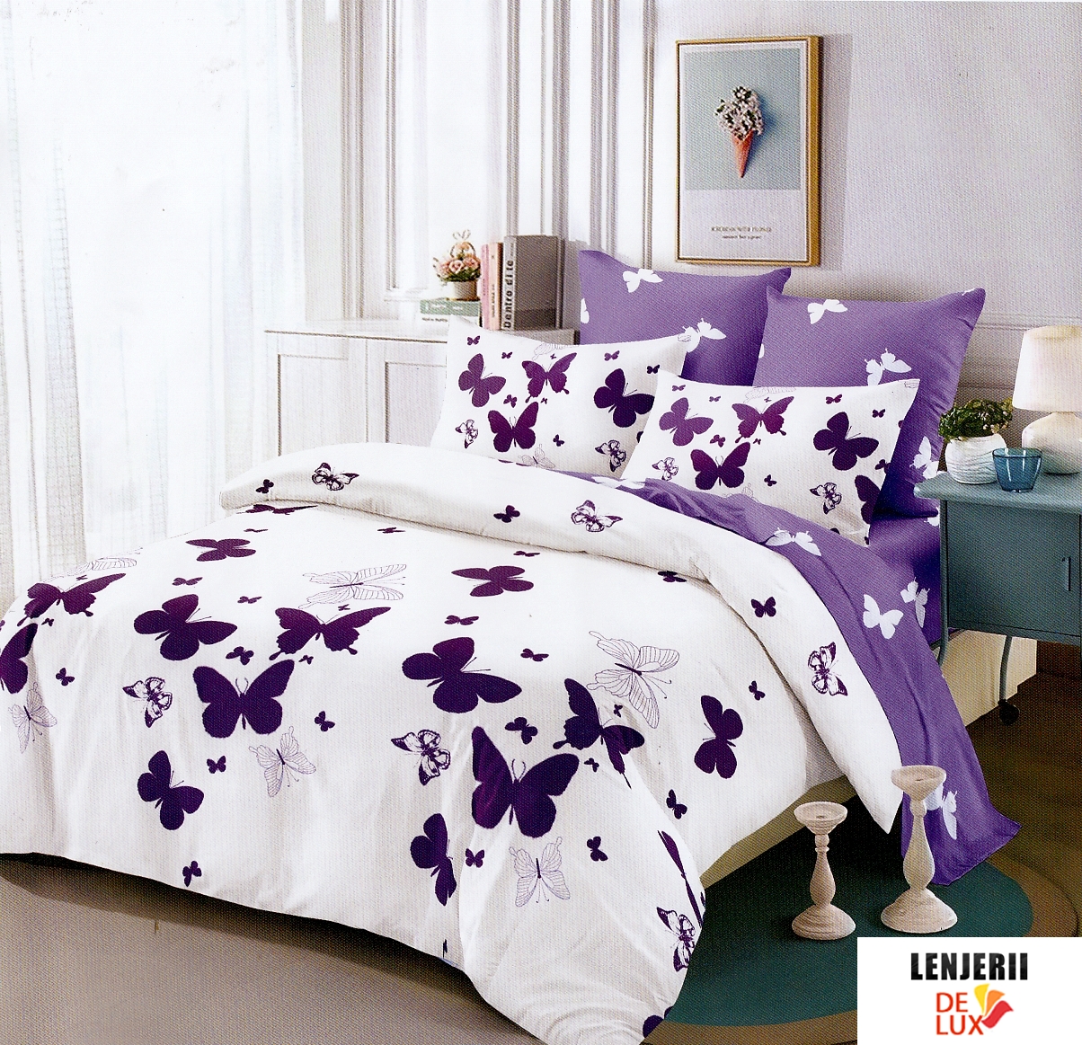 Prezentare 1+1 Gratis Lenjerie de pat din finet alba cu fluturi mov formata din 6 piese