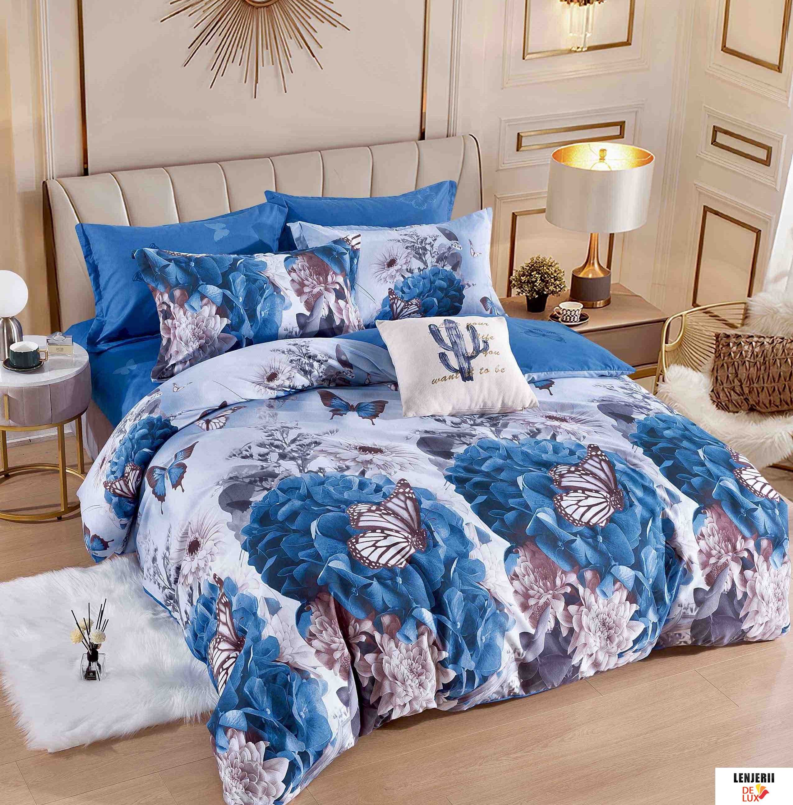 Prezentare 1+1 Gratis Lenjerie de pat din finet cu imprimeuri albastre formata din 6 piese