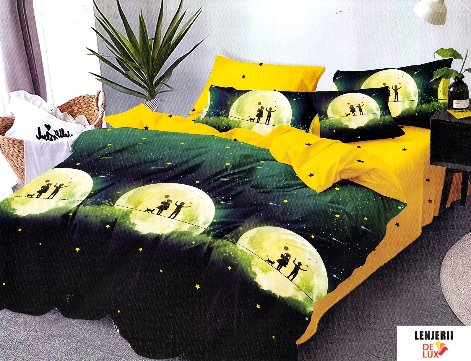 Prezentare 1+1 GRATIS Lenjerie de pat din finet cu luna imprimata formata din 6 piese