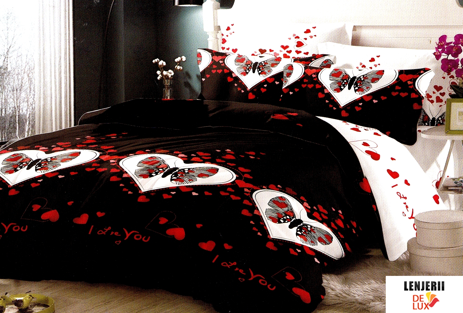 Prezentare 1+1 Gratis Lenjerie de pat neagra cu inimioare din finet formata din 6 piese