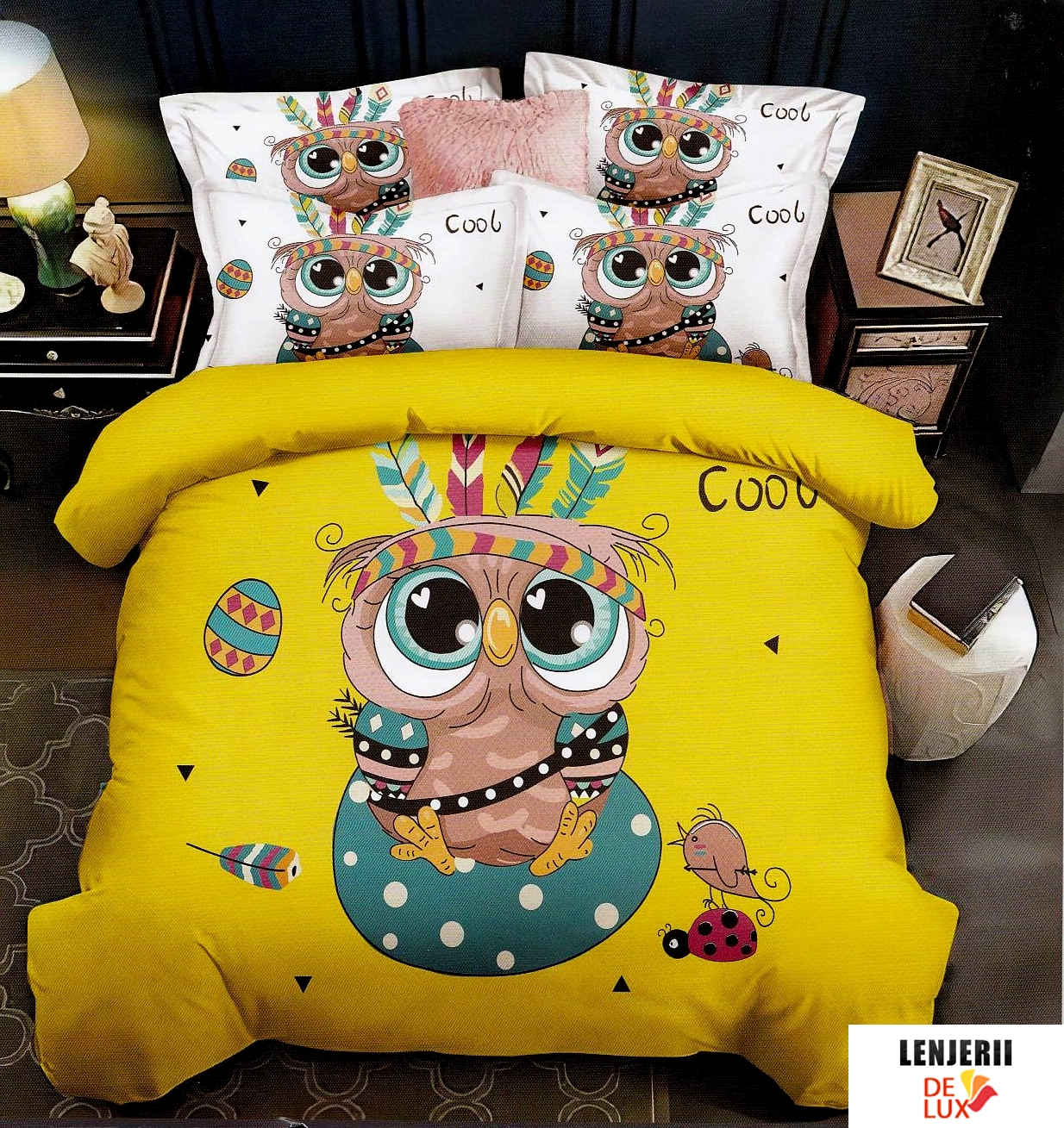 1+1 Gratis Lenjerie de pat pentru copii premium din finet cu pui de bufnita imprimate formata din 6 piese