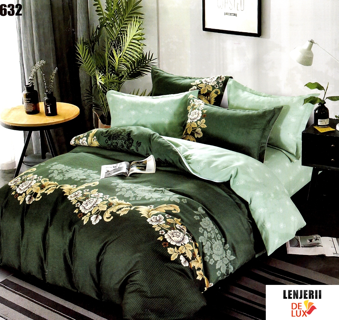 Prezentare 1+1 Gratis Lenjerie de pat verde cu flori din finet Pucioasa formata din 6 piese