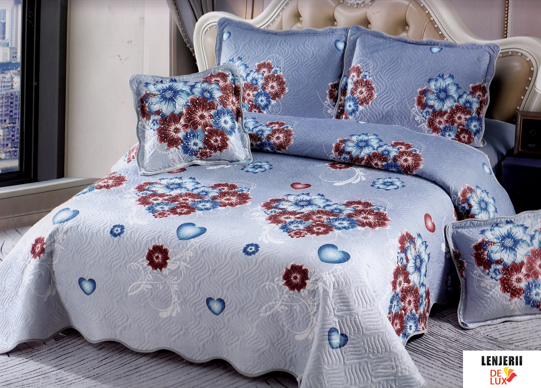 Prezentare Cuvertura matlasata pentru pat bleu cu flori formata din 5 piese