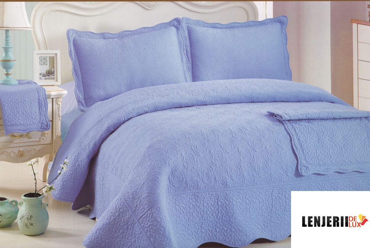 Cuvertura pat 3 piese albastra cu broderie si imprimeuri