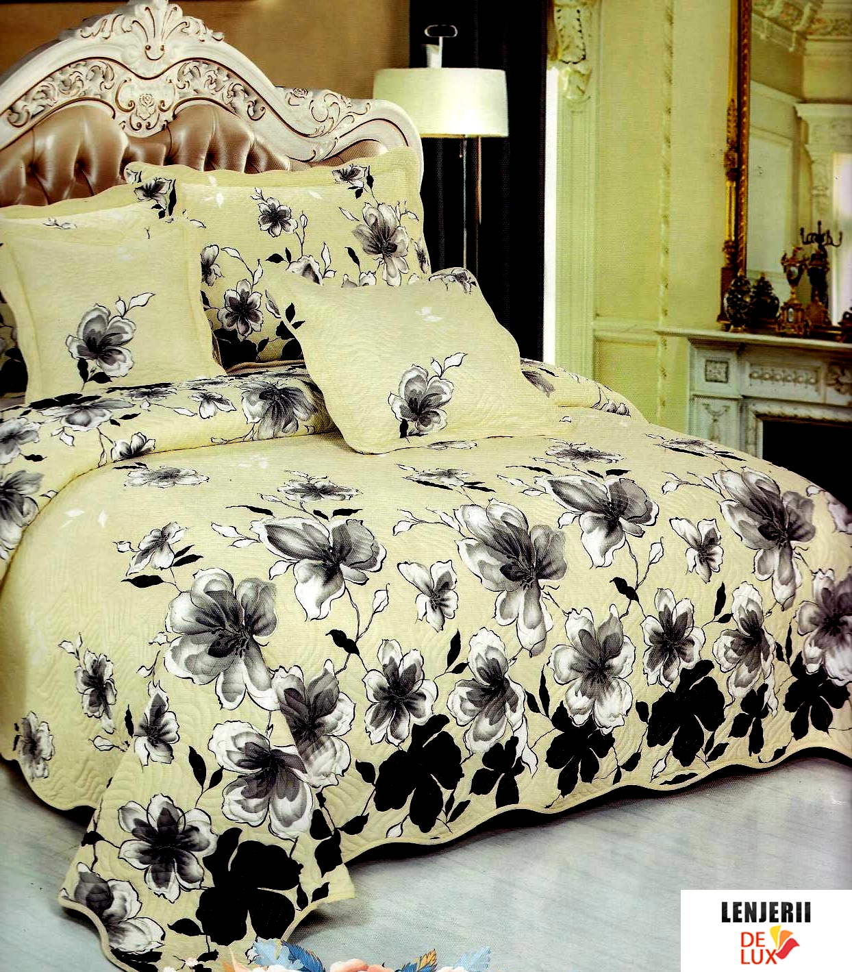 Prezentare Cuvertura pat 5 piese galbena cu flori negre