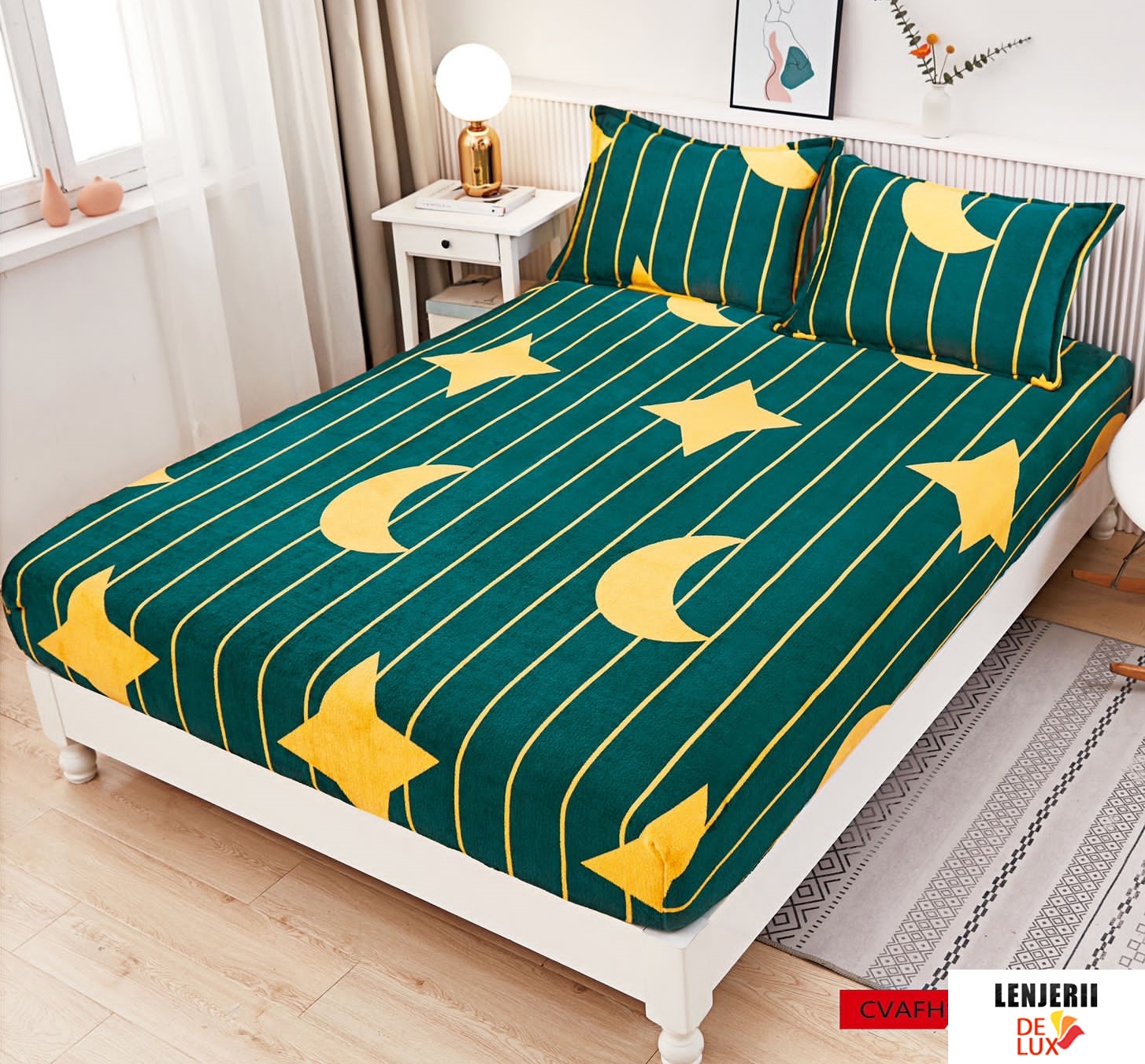 Husa de pat 180x200 cm + 2 fete de perna 50x80 cm Cocolino cu luna si stele