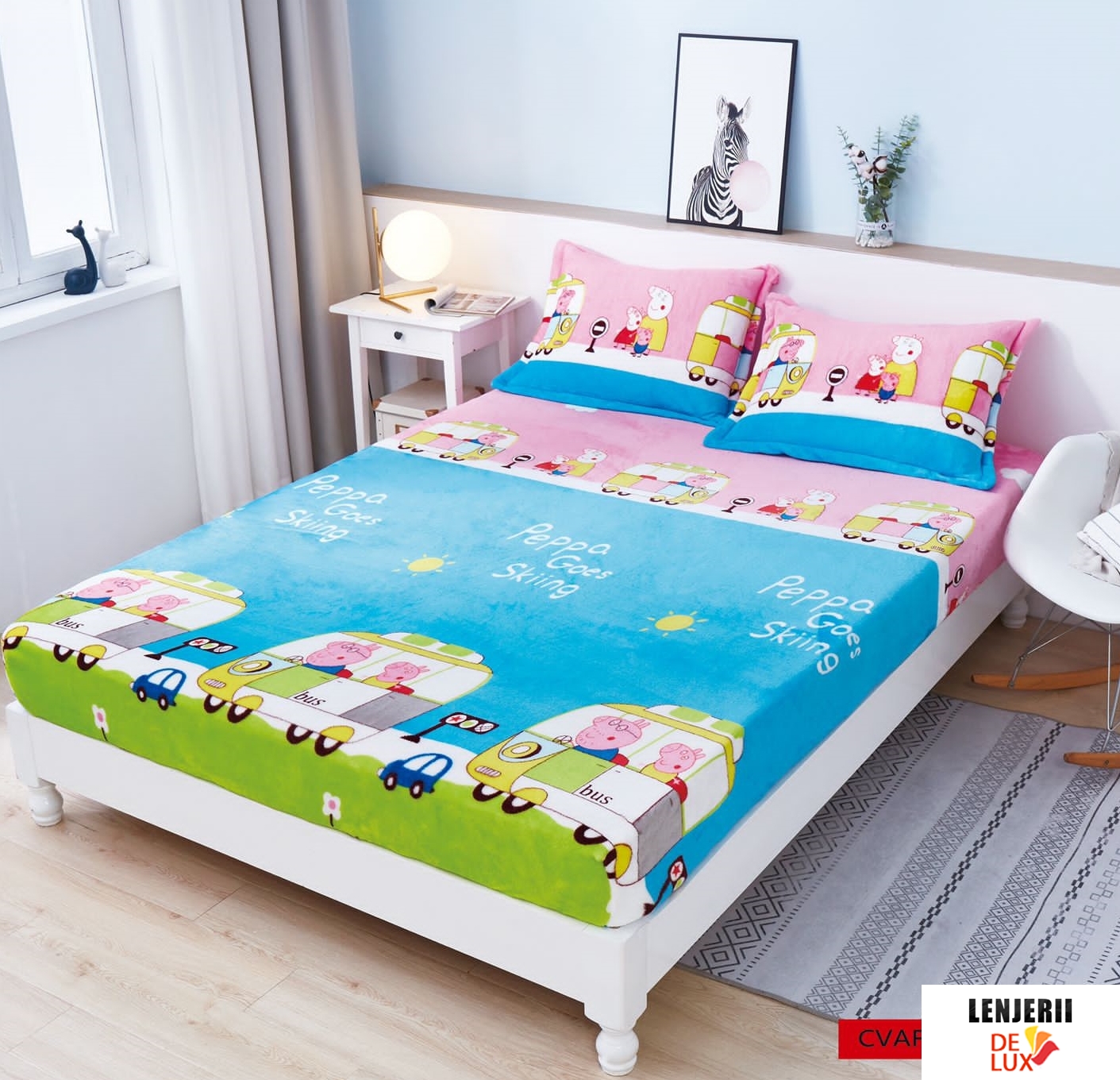 Prezentare Husa de pat 180x200 cm + 2 fete de perna 50x80 cm Cocolino cu Peppa Pig