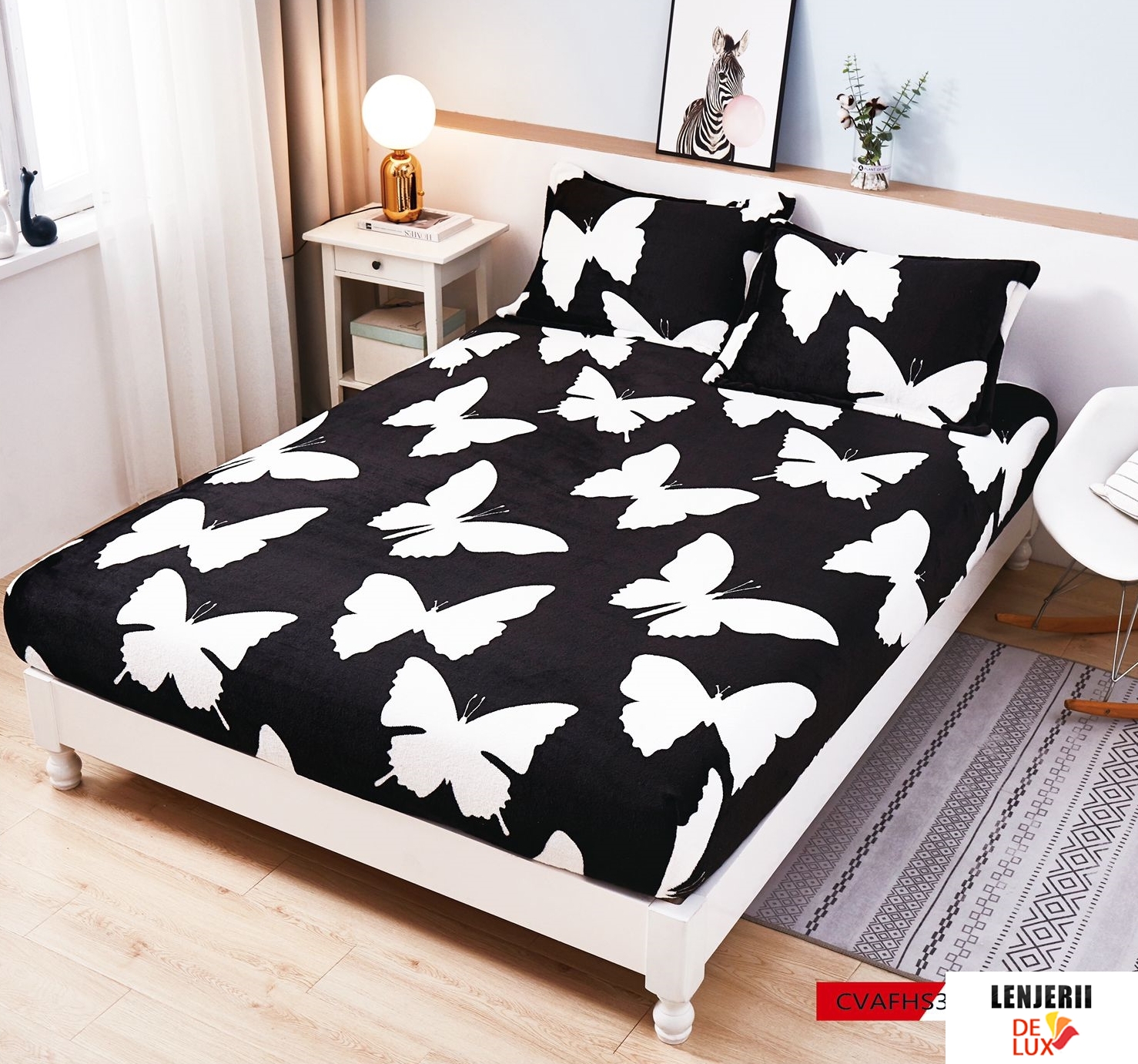 Prezentare Husa de pat 180x200 cm + 2 fete de perna 50x80 cm Cocolino neagra cu fluturi