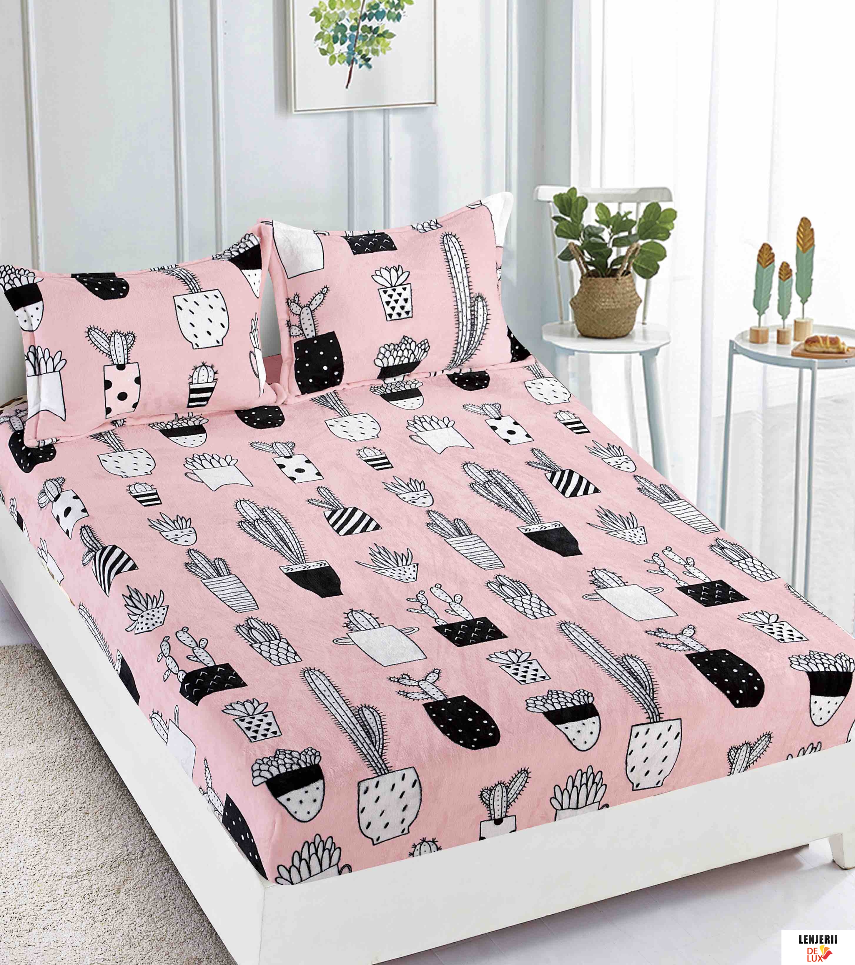 Husa de pat 180x200 cm + 2 fete de perna 50x70 cm Cocolino roz cu imprimeuri