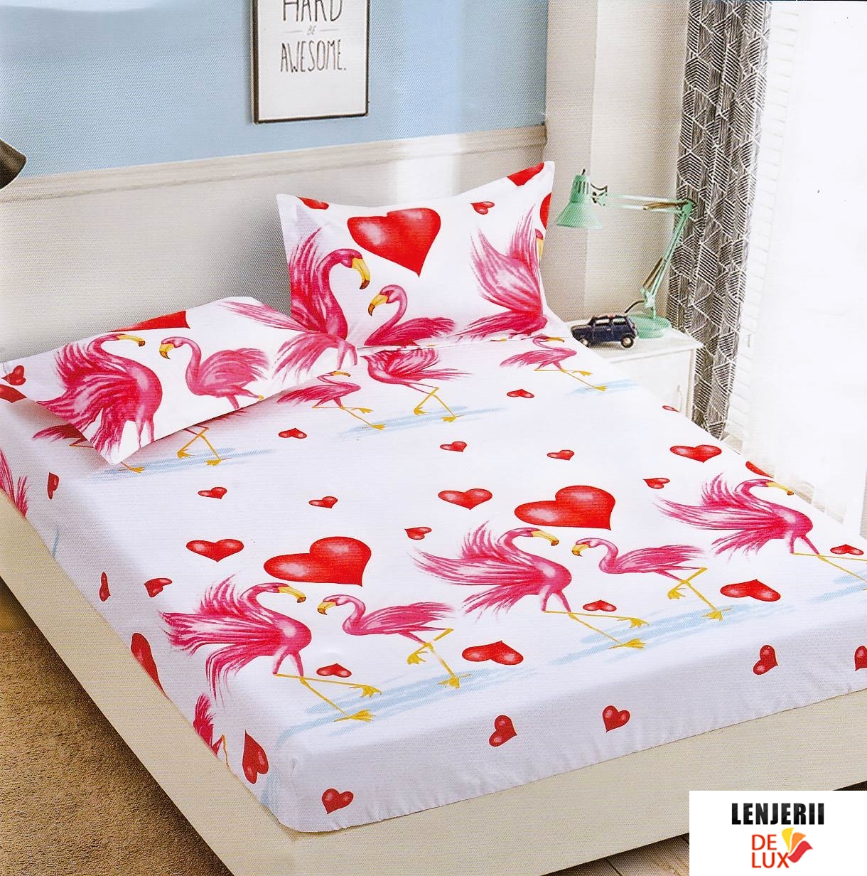 Prezentare Husa de pat din finet alba cu roz cu flamingo + 2 fete de perna - Saltea 180x200