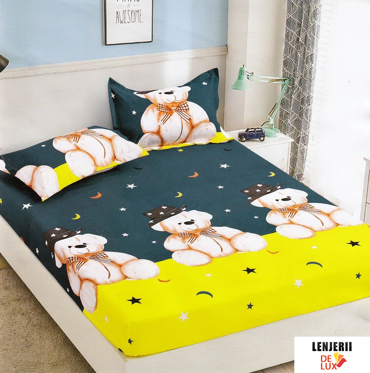 Husa de pat din finet albastra cu galben si ursuleti + 2 fete de perna - Saltea 180x200