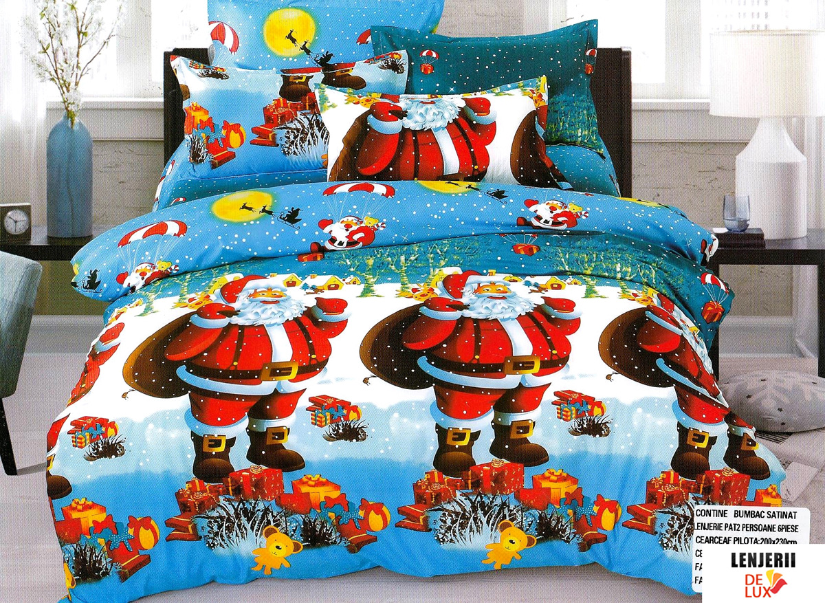 Lenjerie bumbac satinat Pucioasa cu Mos Craciun 6 piese + punga cadou 014