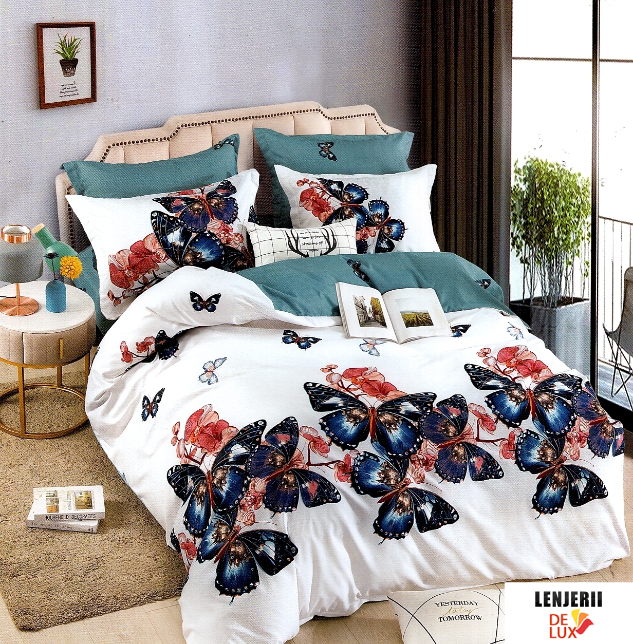 Lenjerie de pat alba cu fluturi colorati din finet Casa New Concept formata din 6 piese + Pilota
