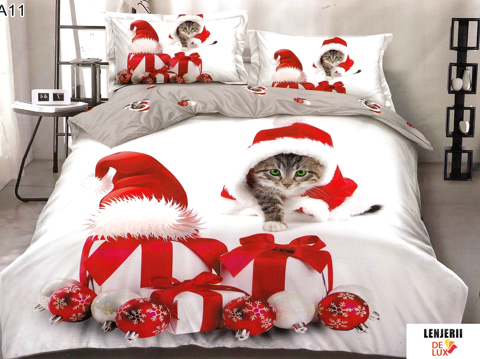 Prezentare Lenjerie de pat alba din finet cu pisicuta din Colectia Mos Craciun formata din 6 piese