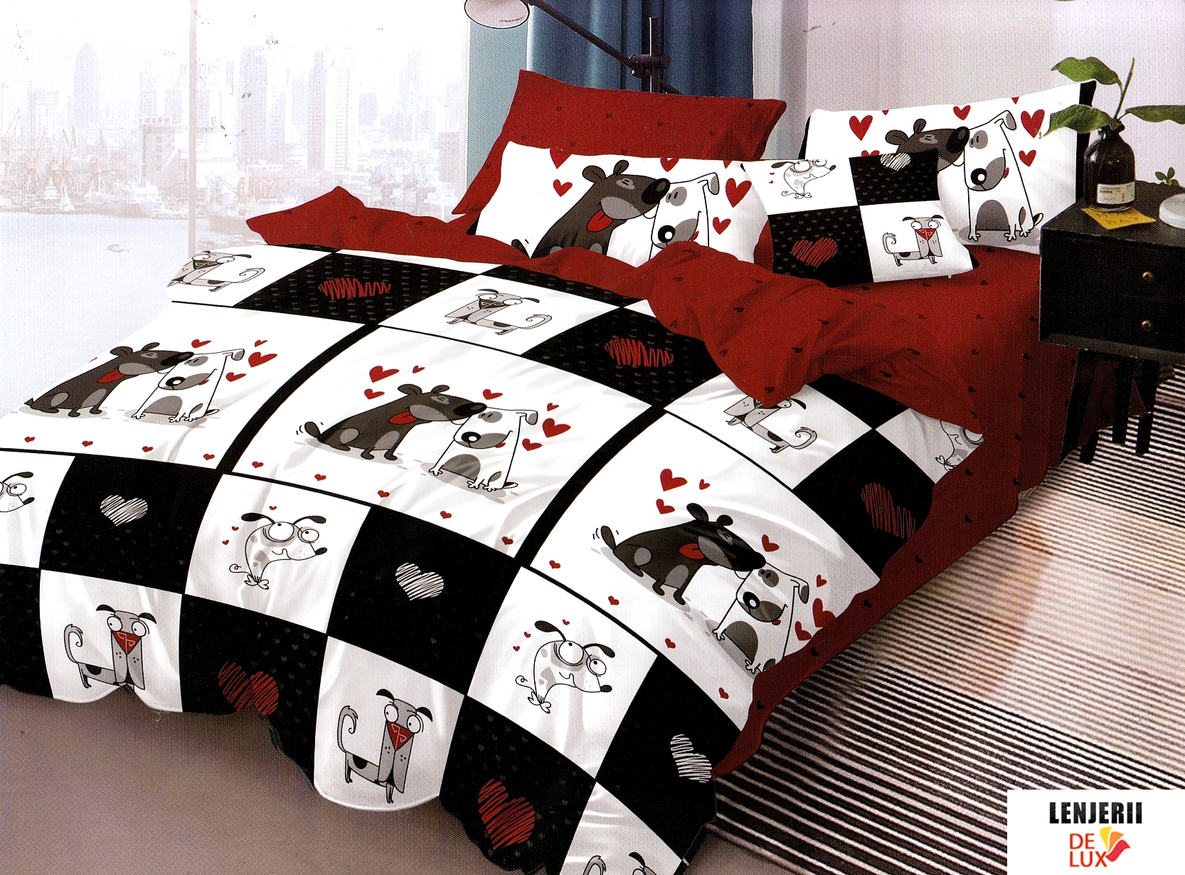 Lenjerie de pat cu catelusi si inimioare din finet formata din 6 piese TRIO