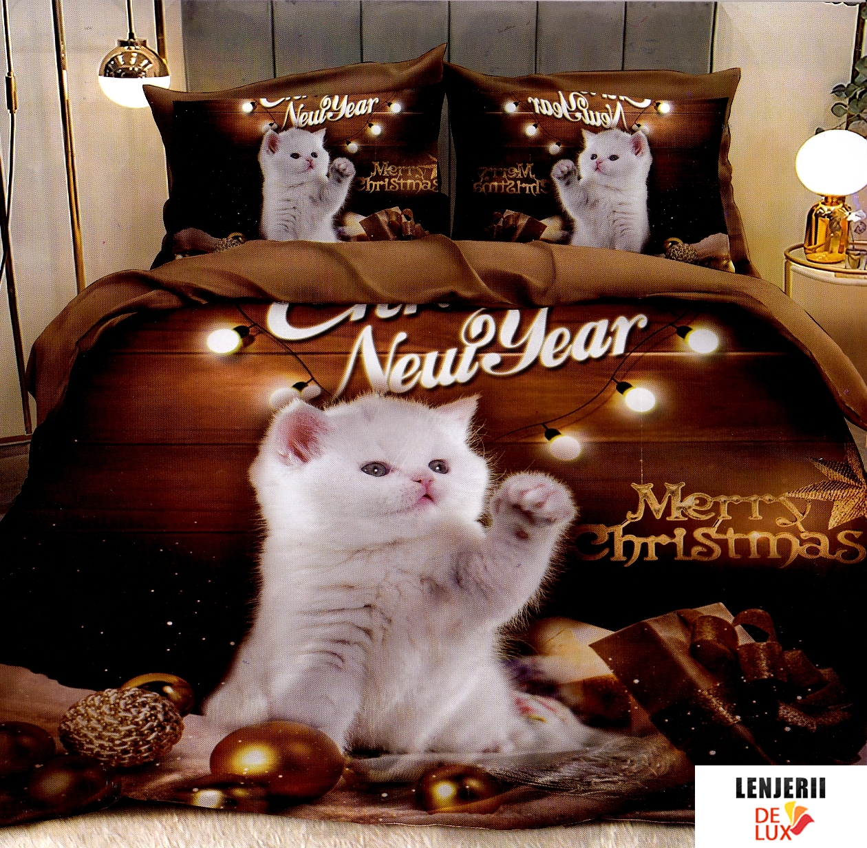 Prezentare Lenjerie de pat cu elastic din finet cu globuri aurii si pisicuta formata din 6 piese