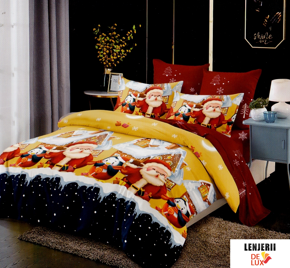 Prezentare Lenjerie de pat cu elastic din finet cu Mos Craciun formata din 6 piese