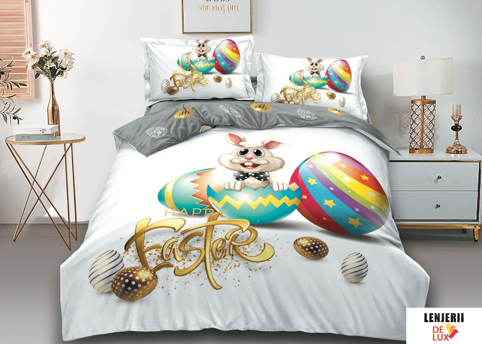 Colectie speciala de Paste! Lenjerii de pat cu iepurasi si oua de Paste din finet formate din 6 piese oferita de magazinul online Lenjerii de lux.
