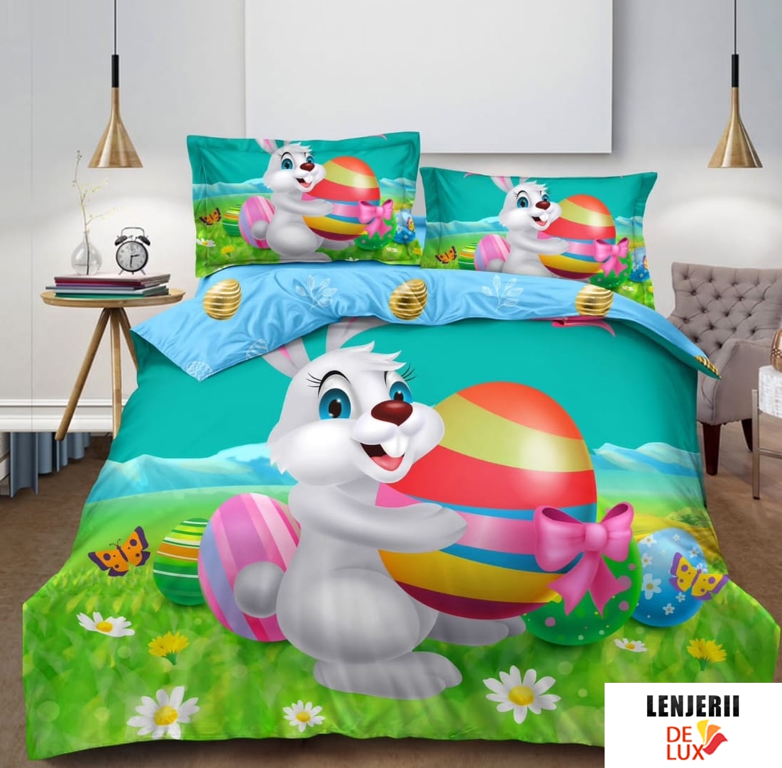 Colectie speciala de Paste! Lenjerii de pat cu iepurasi si oua de Paste din finet formate din 6 piese oferita de magazinul online Lenjerii de lux.