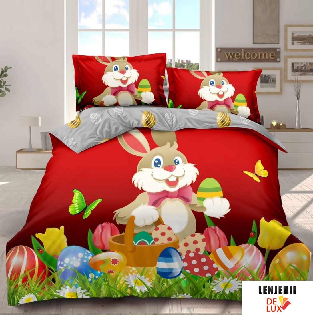 Prezentare Lenjerie de pat cu iepurasi si oua de Paste din finet formata din 4 piese 09