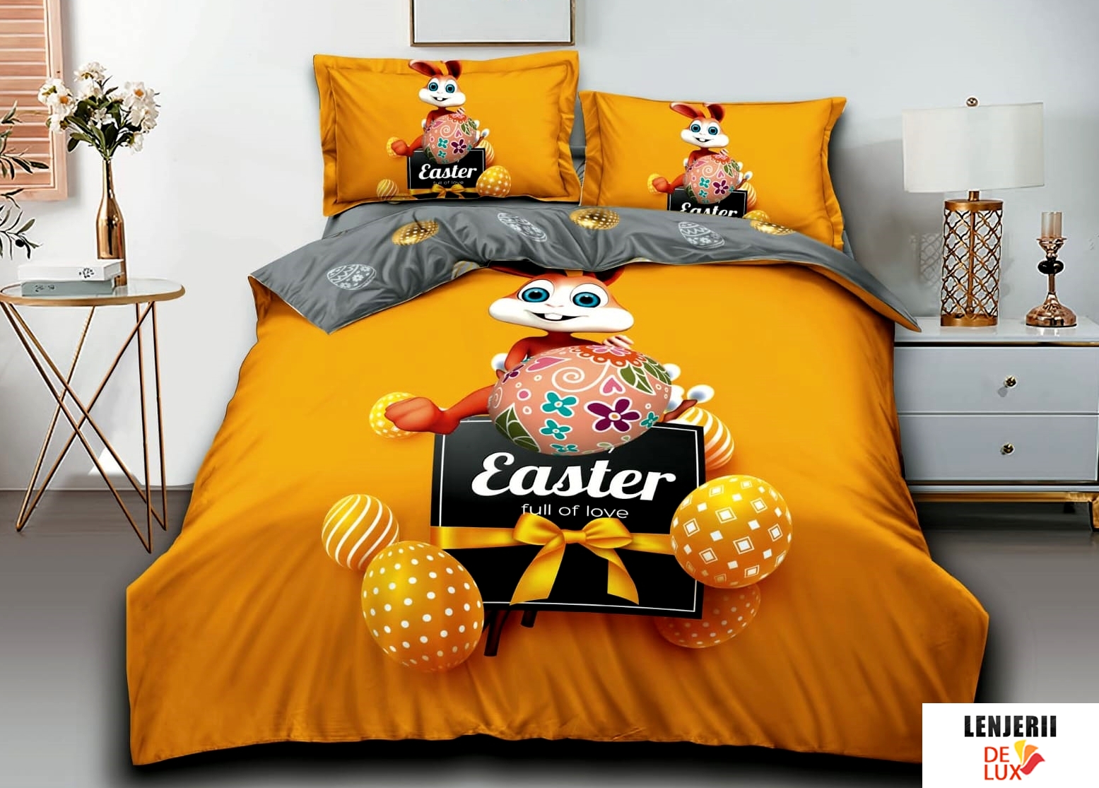 Colectie speciala de Paste! Lenjerii de pat cu iepurasi si oua de Paste din finet formate din 6 piese oferita de magazinul online Lenjerii de lux.