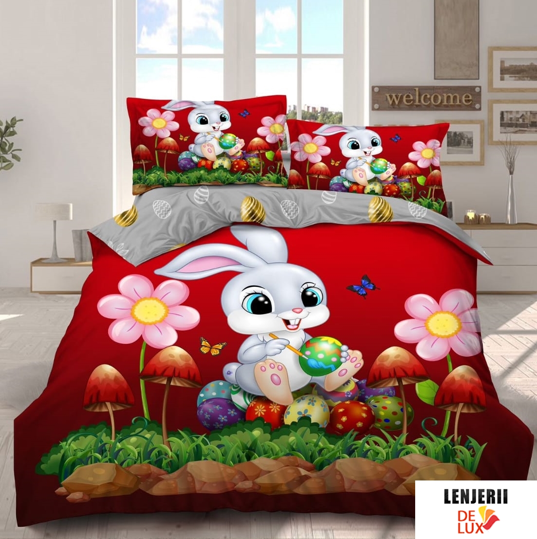 Prezentare Lenjerie de pat cu iepurasi si oua de Paste din finet formata din 4 piese 22