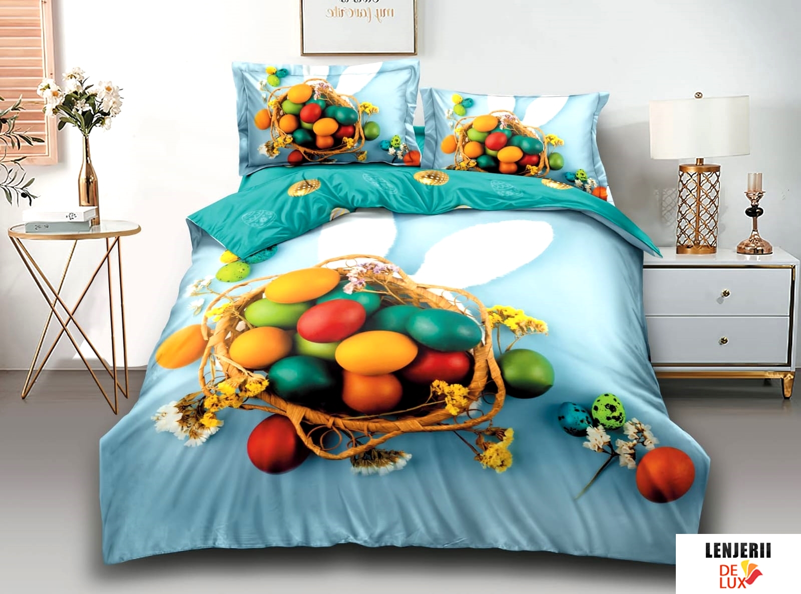 Colectie speciala de Paste! Lenjerii de pat cu iepurasi si oua de Paste din finet formate din 6 piese oferita de magazinul online Lenjerii de lux.