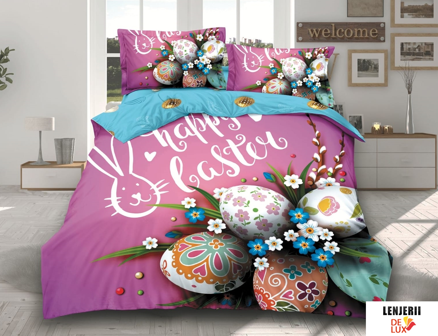 Colectie speciala de Paste! Lenjerii de pat cu iepurasi si oua de Paste din finet formate din 6 piese oferita de magazinul online Lenjerii de lux.