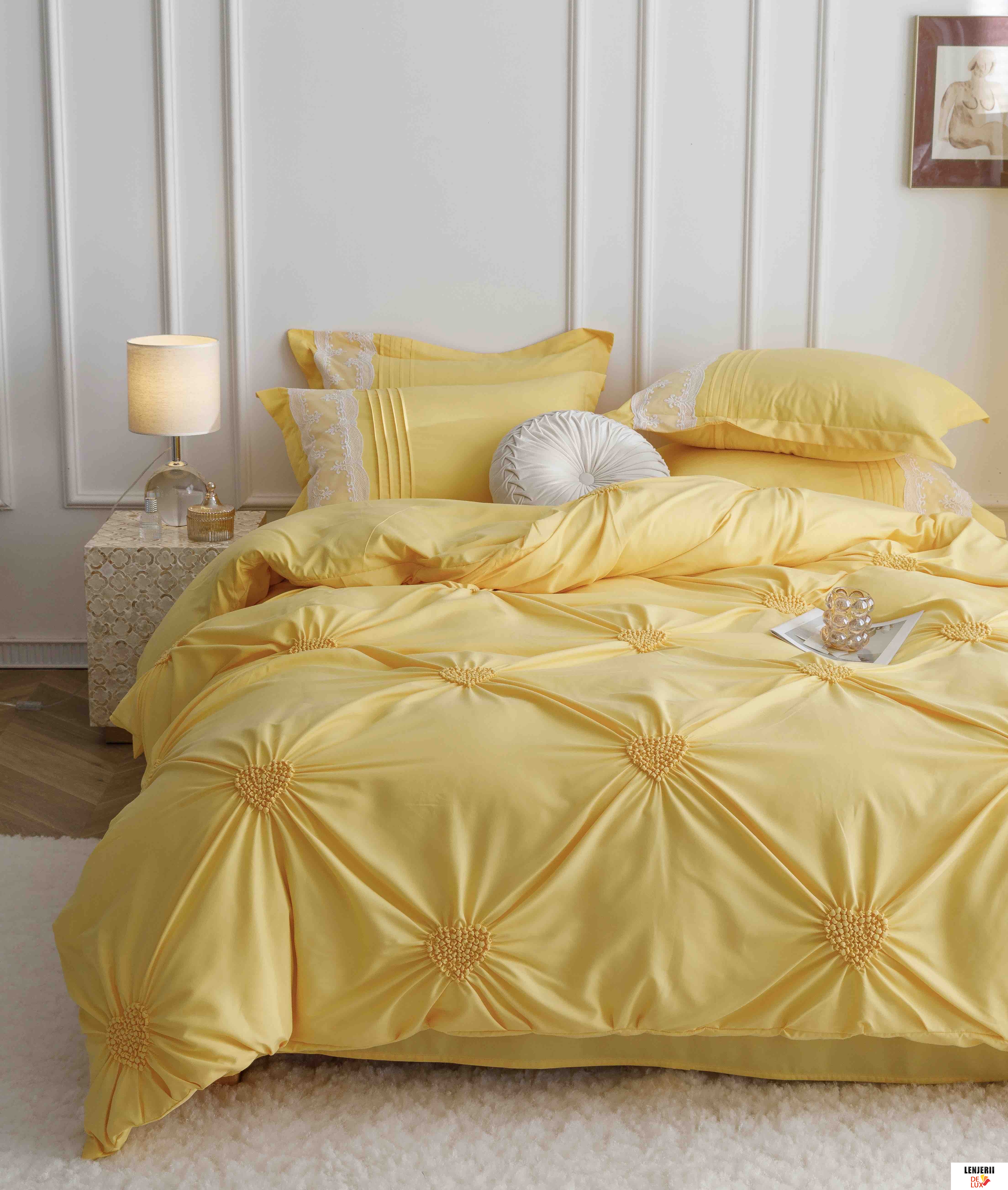 Lenjerie de pat din bumbac finet galbena cu pliuri si broderie formata din 6 piese