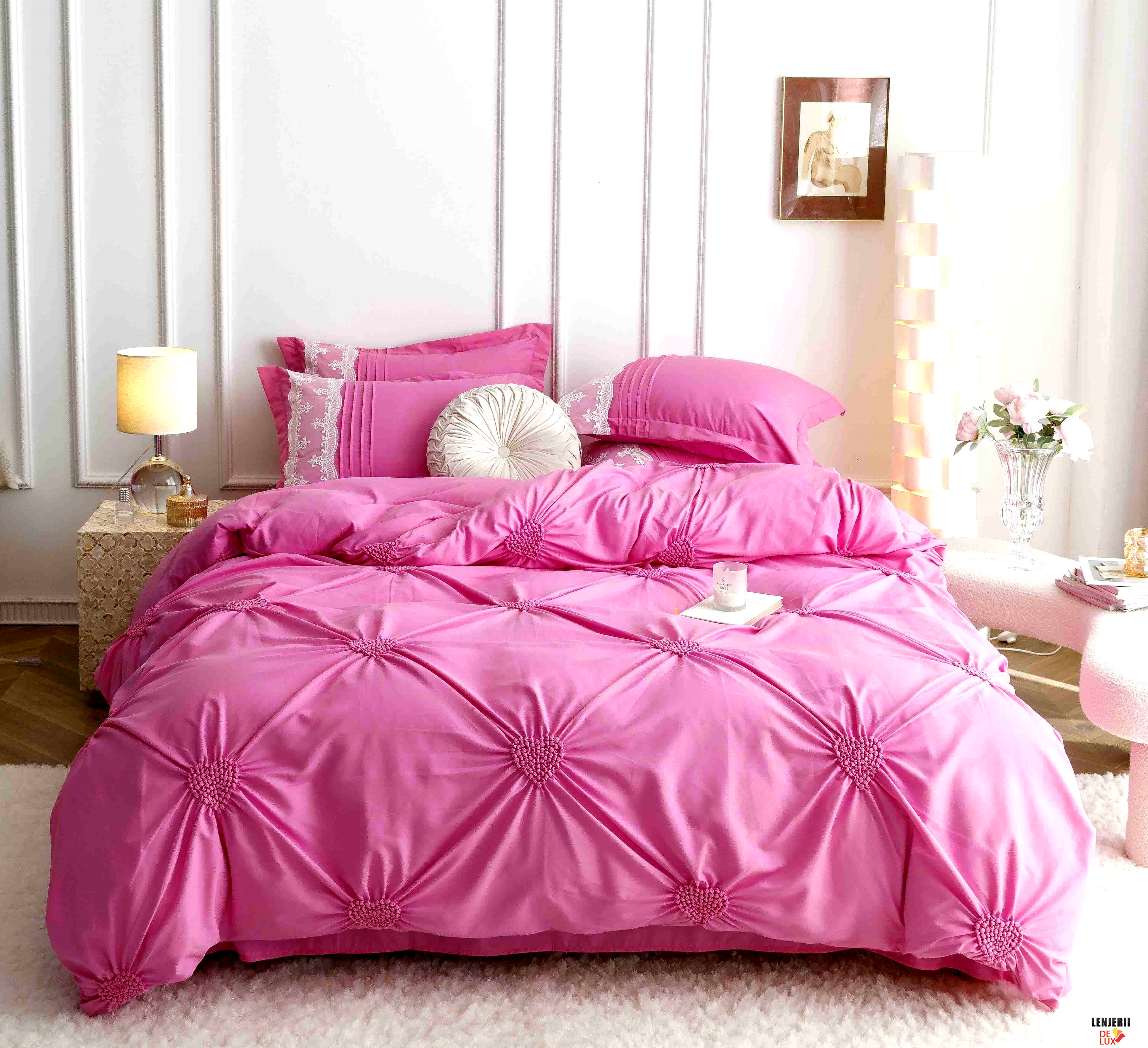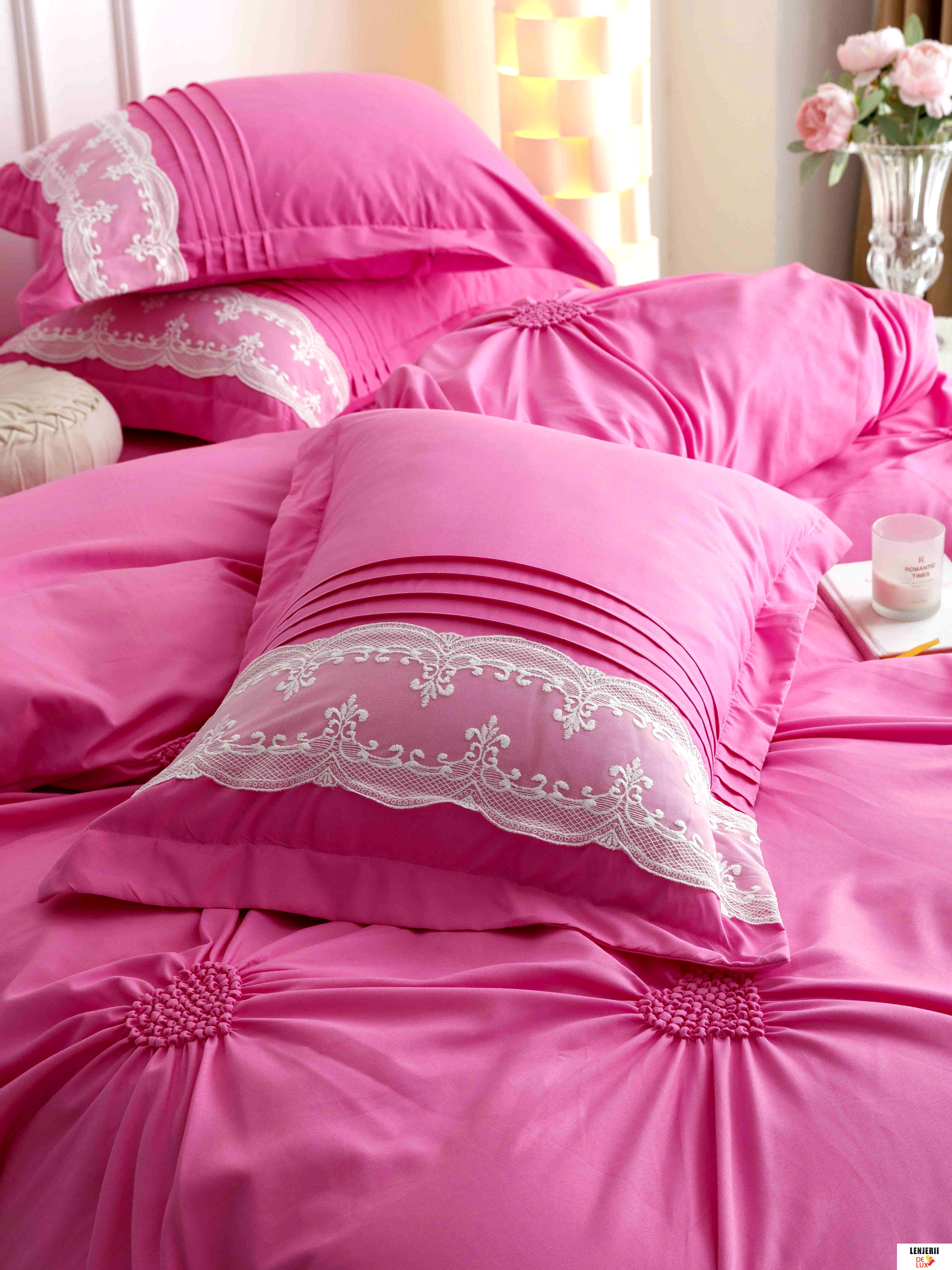Prezentare Lenjerie de pat din bumbac finet roz cu pliuri si broderie formata din 6 piese