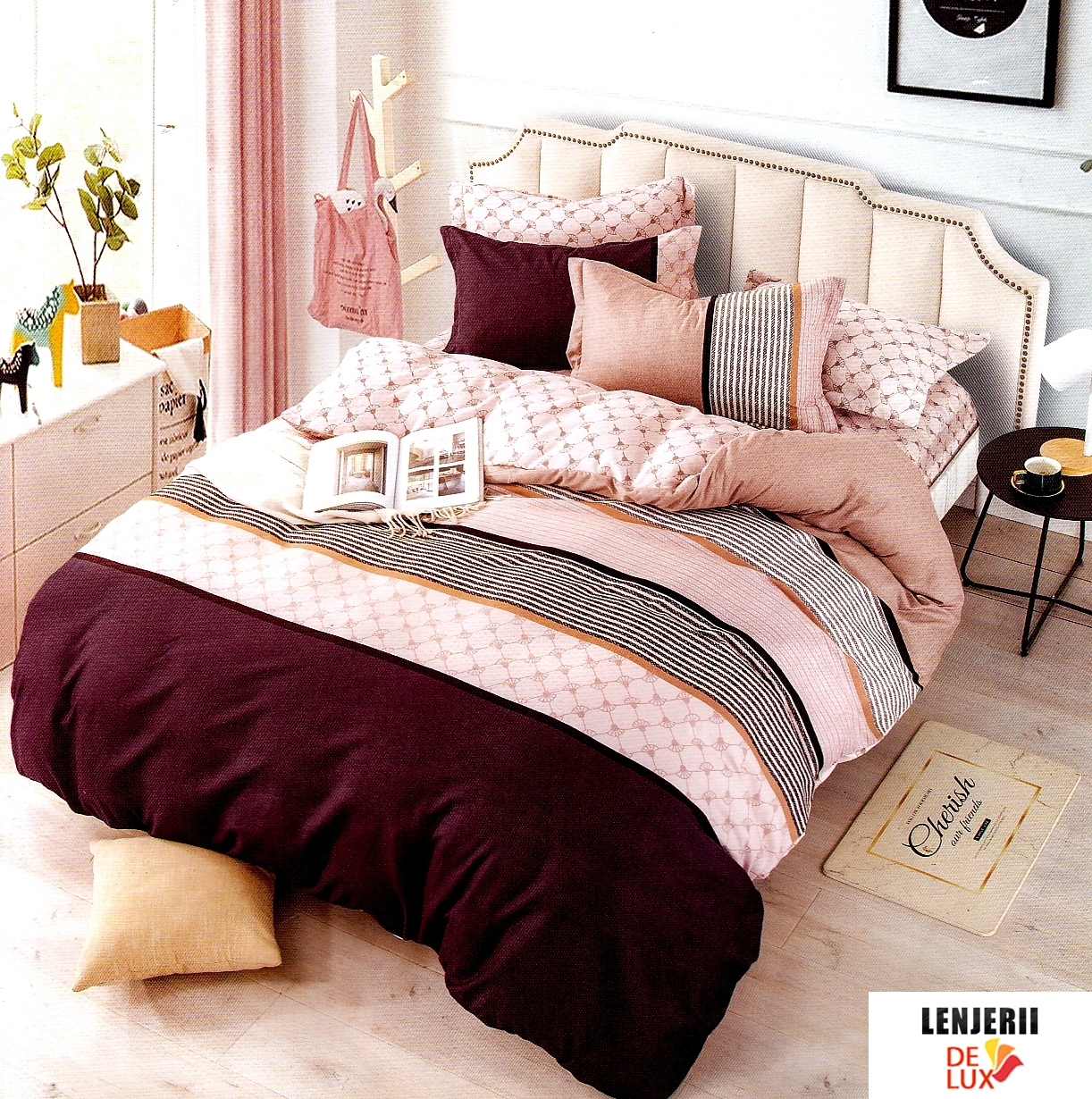 Prezentare Lenjerie de pat din finet cu dungi in nuante de bej formata din 6 piese + PILOTA CADOU