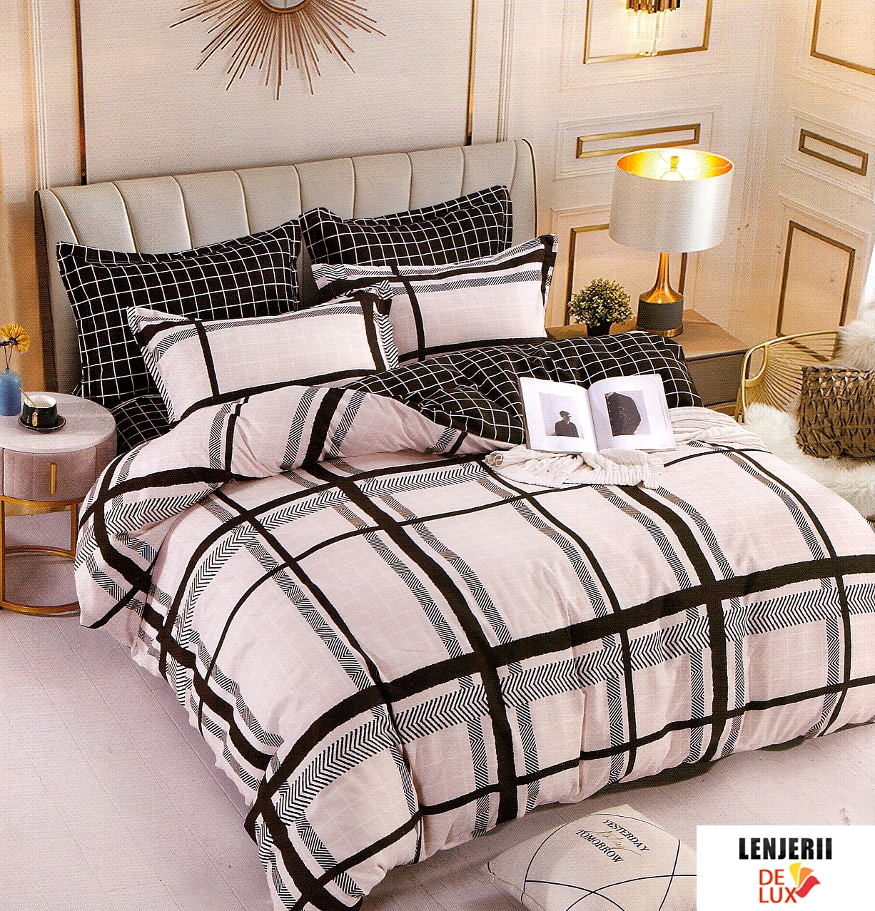 Prezentare Lenjerie de pat din finet cu dungi negre formata din 6 piese + Pilota