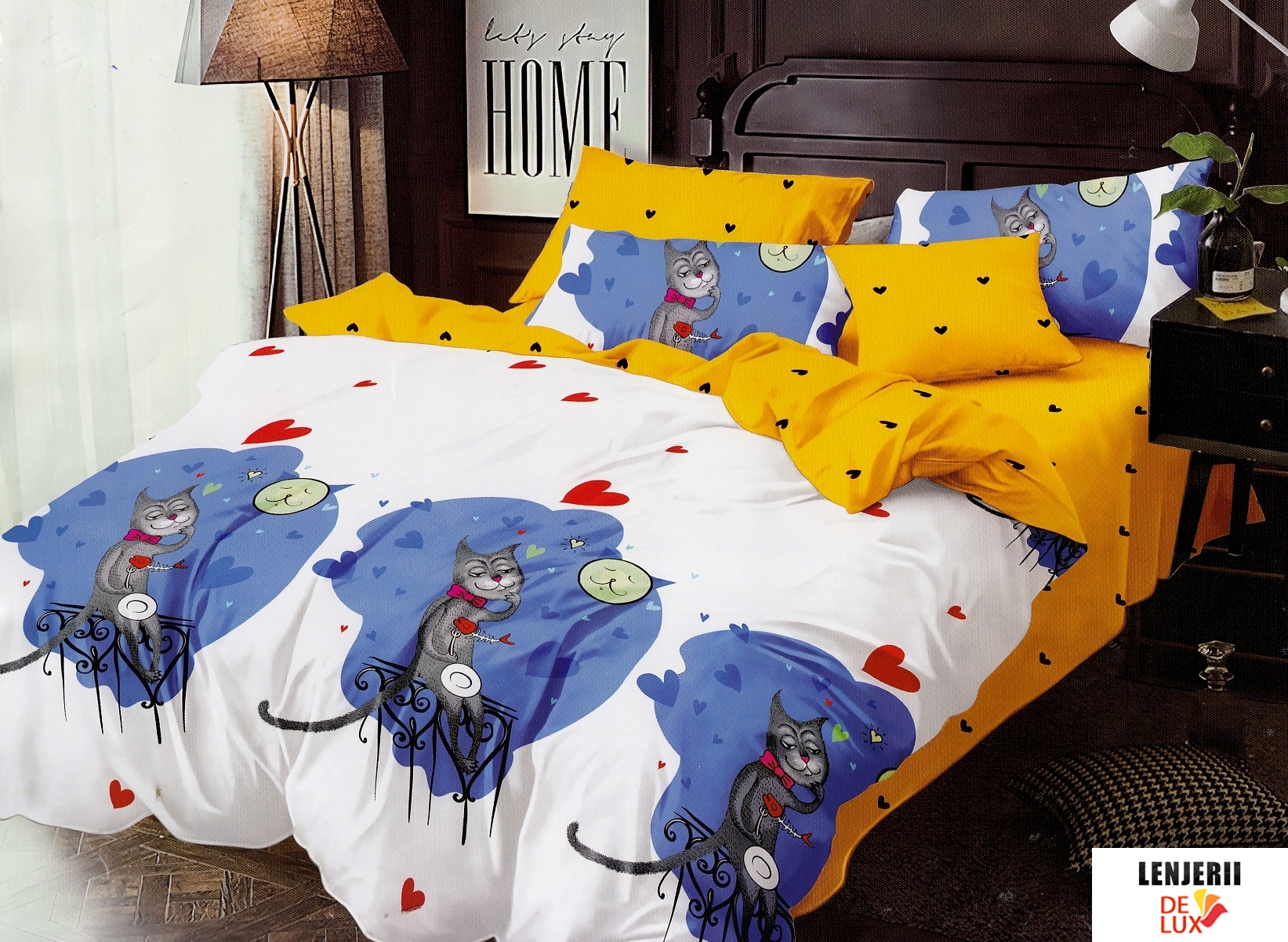 Prezentare Lenjerie de pat din finet cu pisicuta si inimioare formata din 6 piese + Pilota