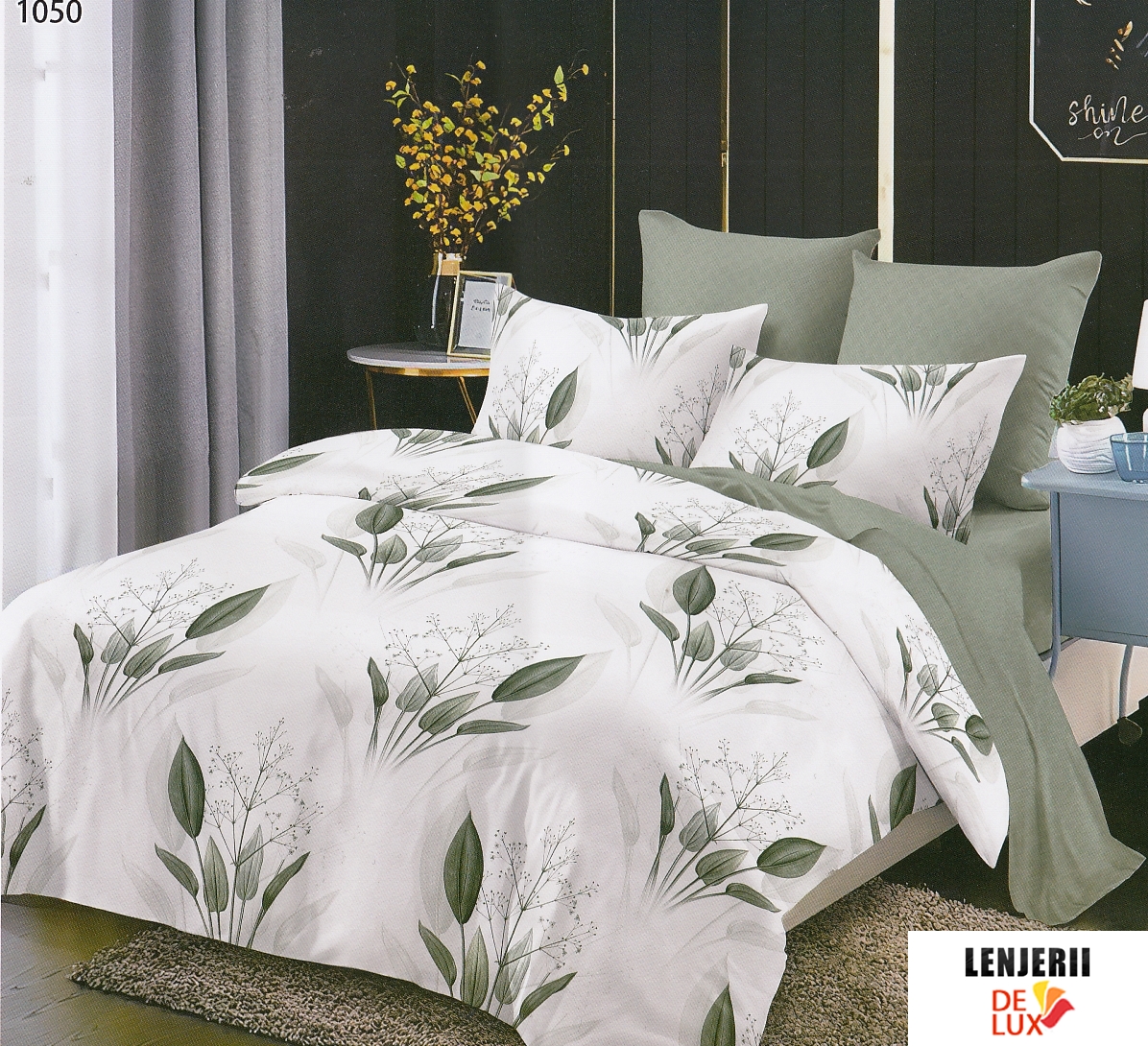 Prezentare Lenjerie de pat din finet Pucioasa alba cu frunze verzi formata din 6 piese + Pilota
