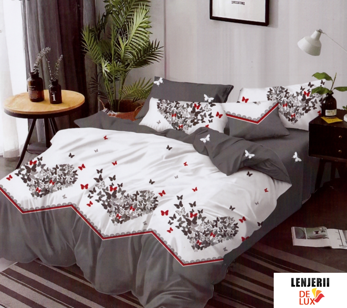 Prezentare Lenjerie de pat din finet Pucioasa cu fluturi gri formata din 6 piese + PILOTA