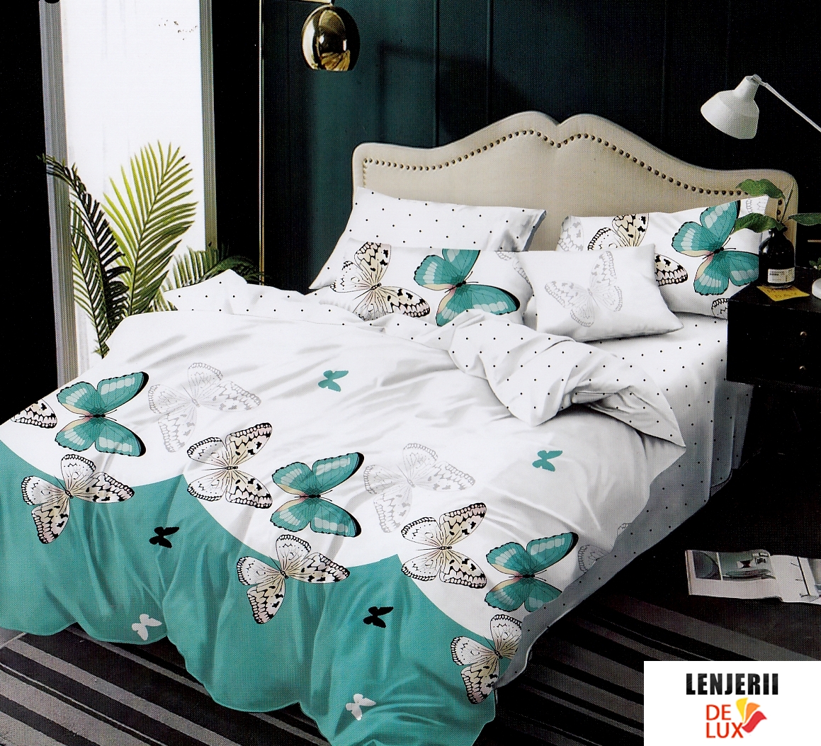 Lenjerie de pat din finet Pucioasa cu fluturi imprimati formata din 6 piese + Pilota