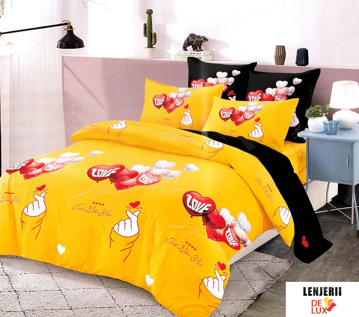 Prezentare Lenjerie de pat galbena din finet cu inimioare formata din 6 piese + Pilota