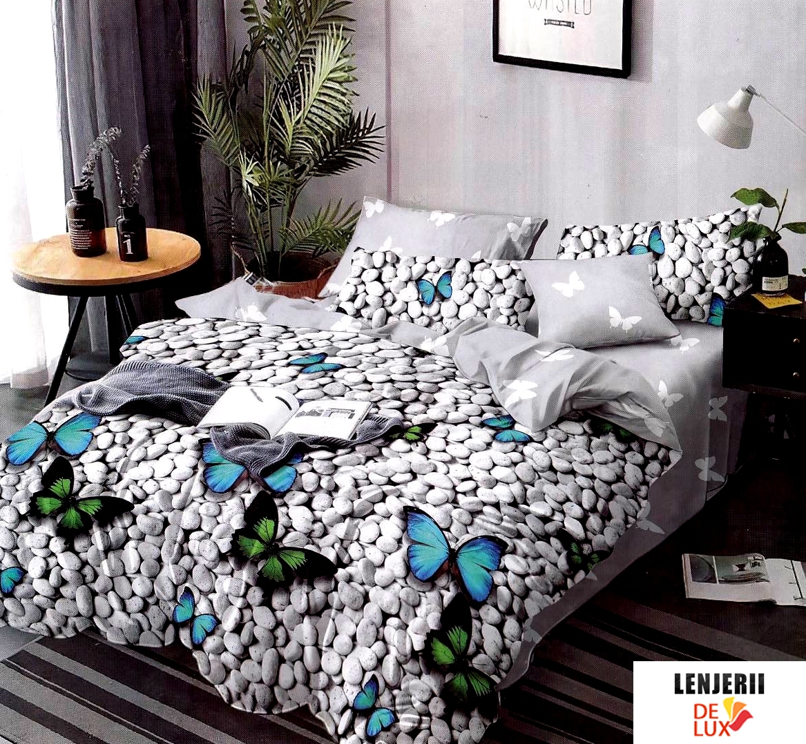 Lenjerie de pat gri cu fluturi imprimati Pucioasa din finet formata din 6 piese + Pilota