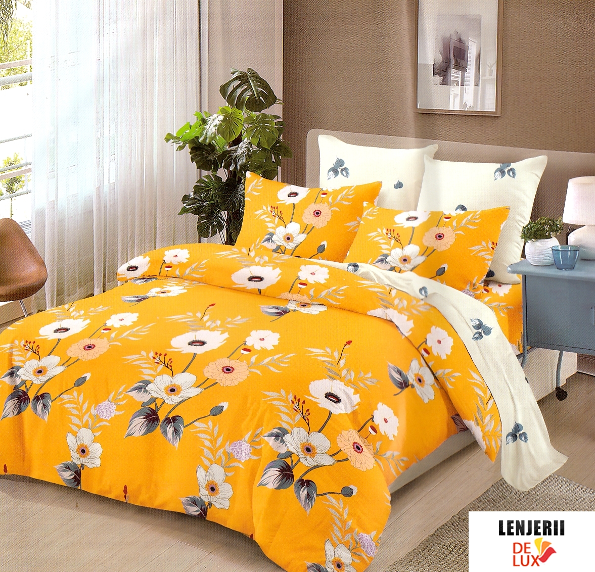 Prezentare Lenjerie de pat Pucioasa galbena cu flori din finet formata din 6 piese + Pilota CADOU