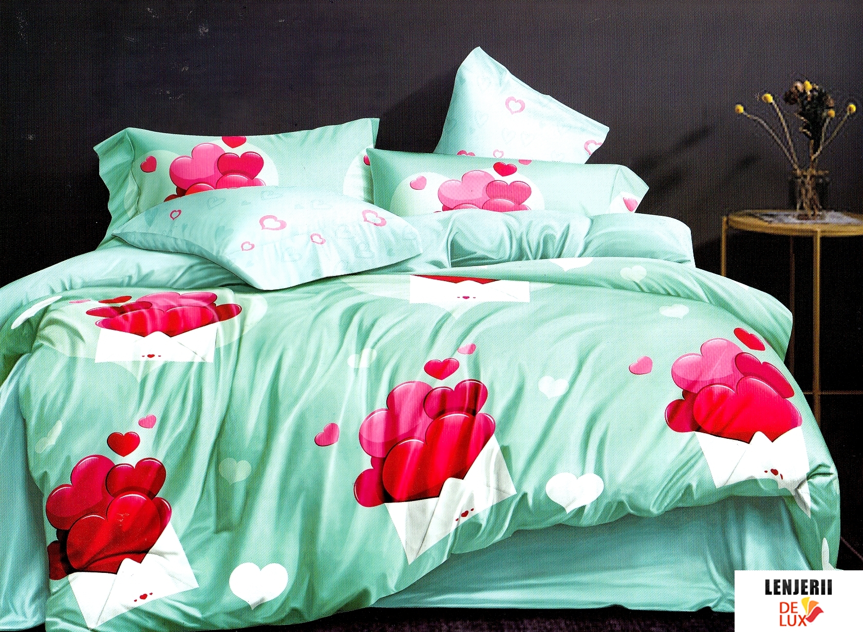 Lenjerie de pat turcoaz din finet cu inimioare formata din 6 piese + Pilota