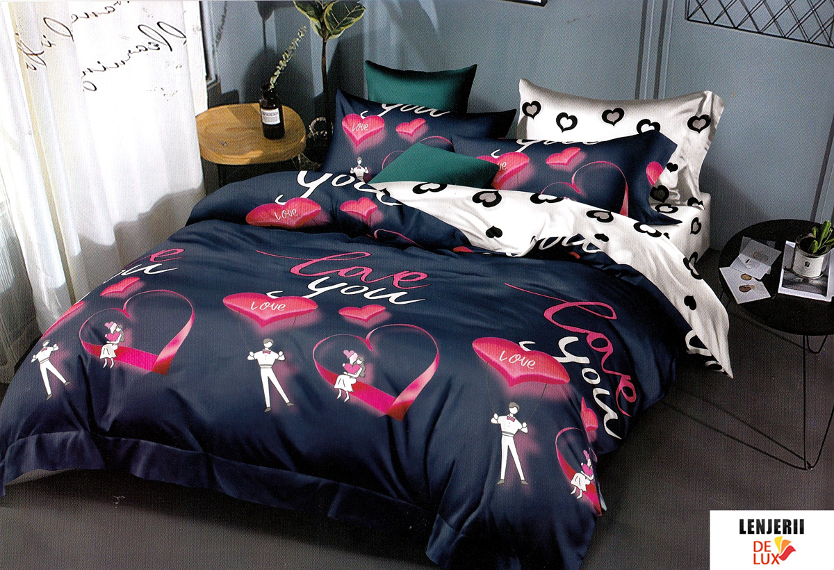 Oferta TRIO Lenjerie de pat albastra cu inimioare roz din finet formata din 6 piese