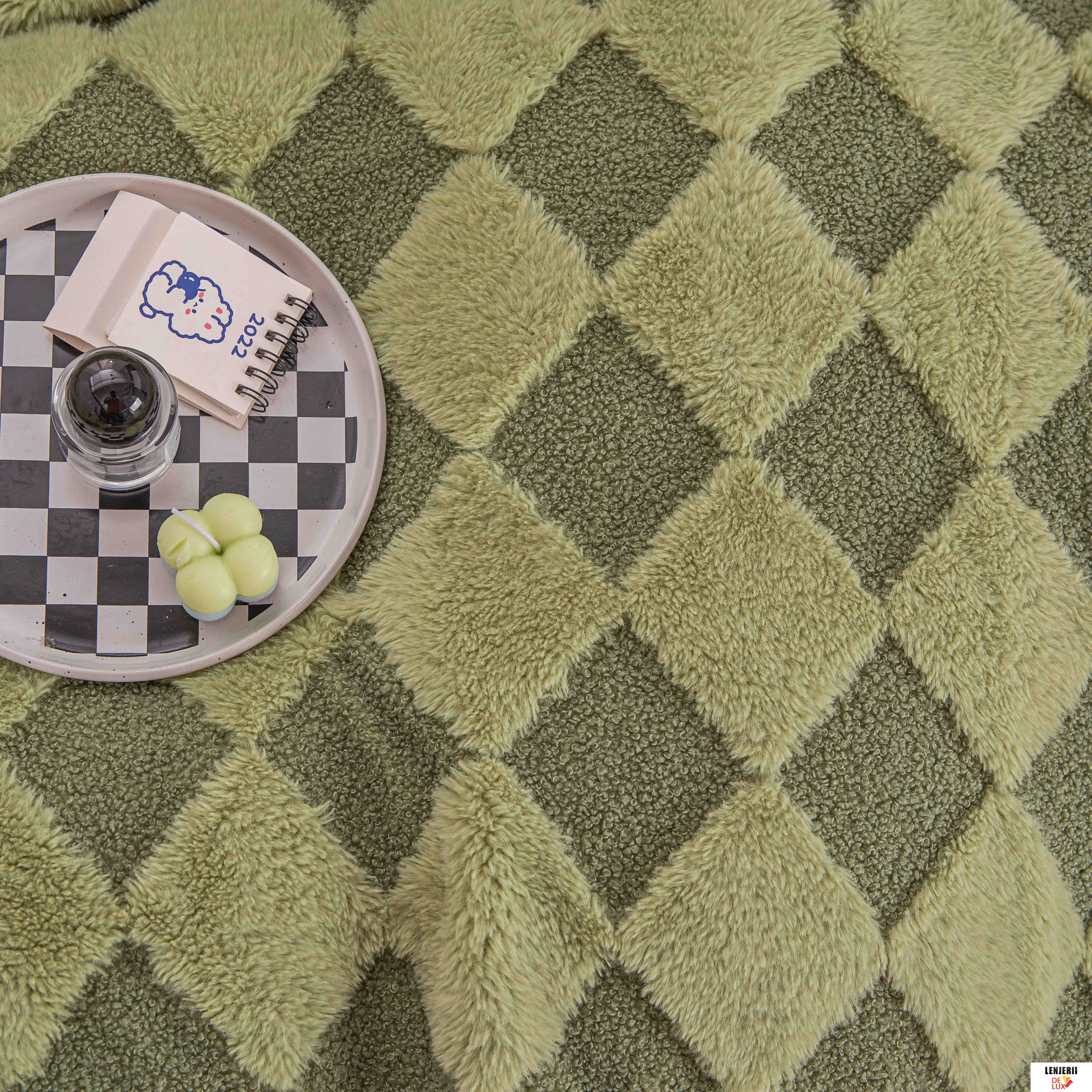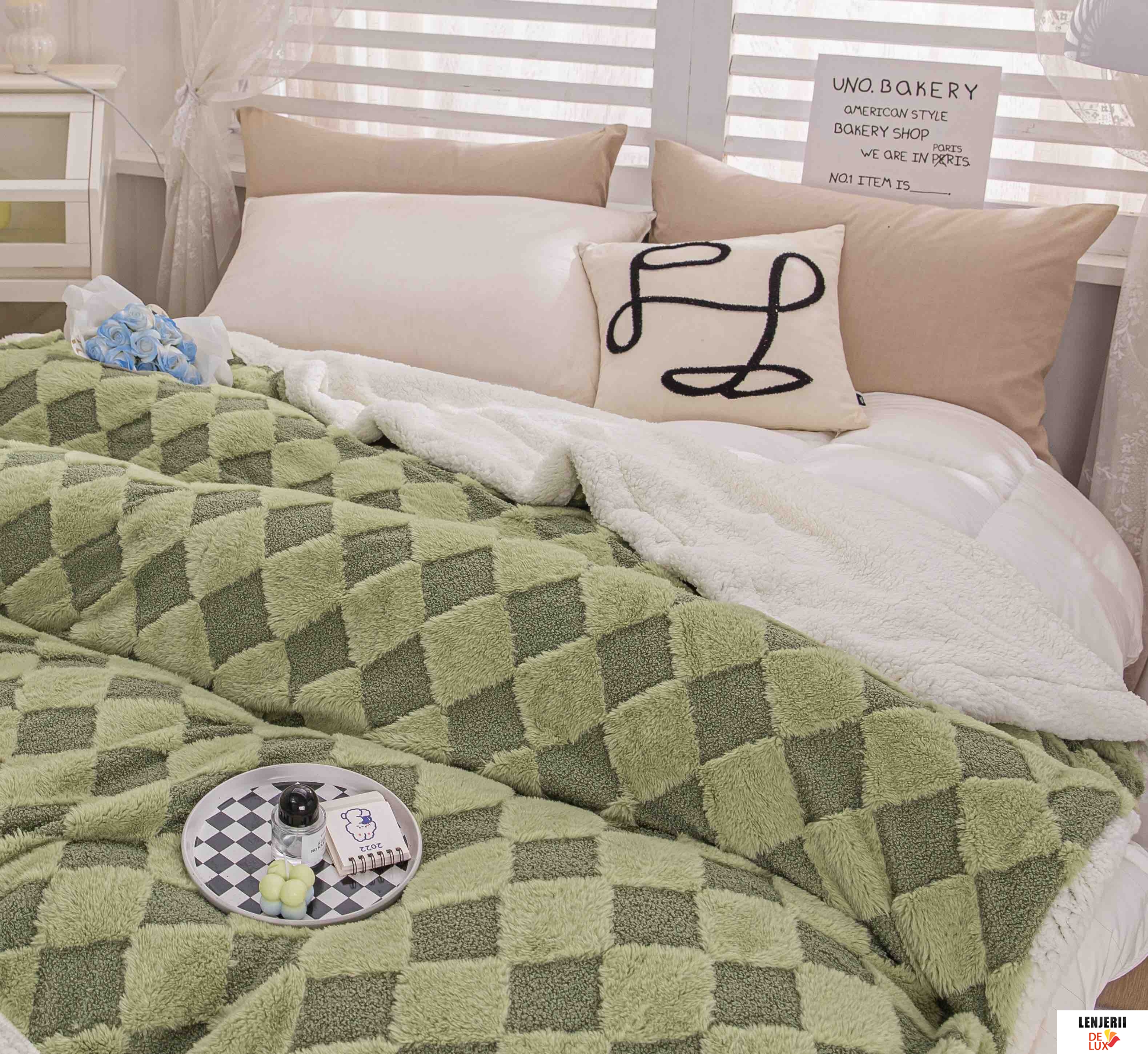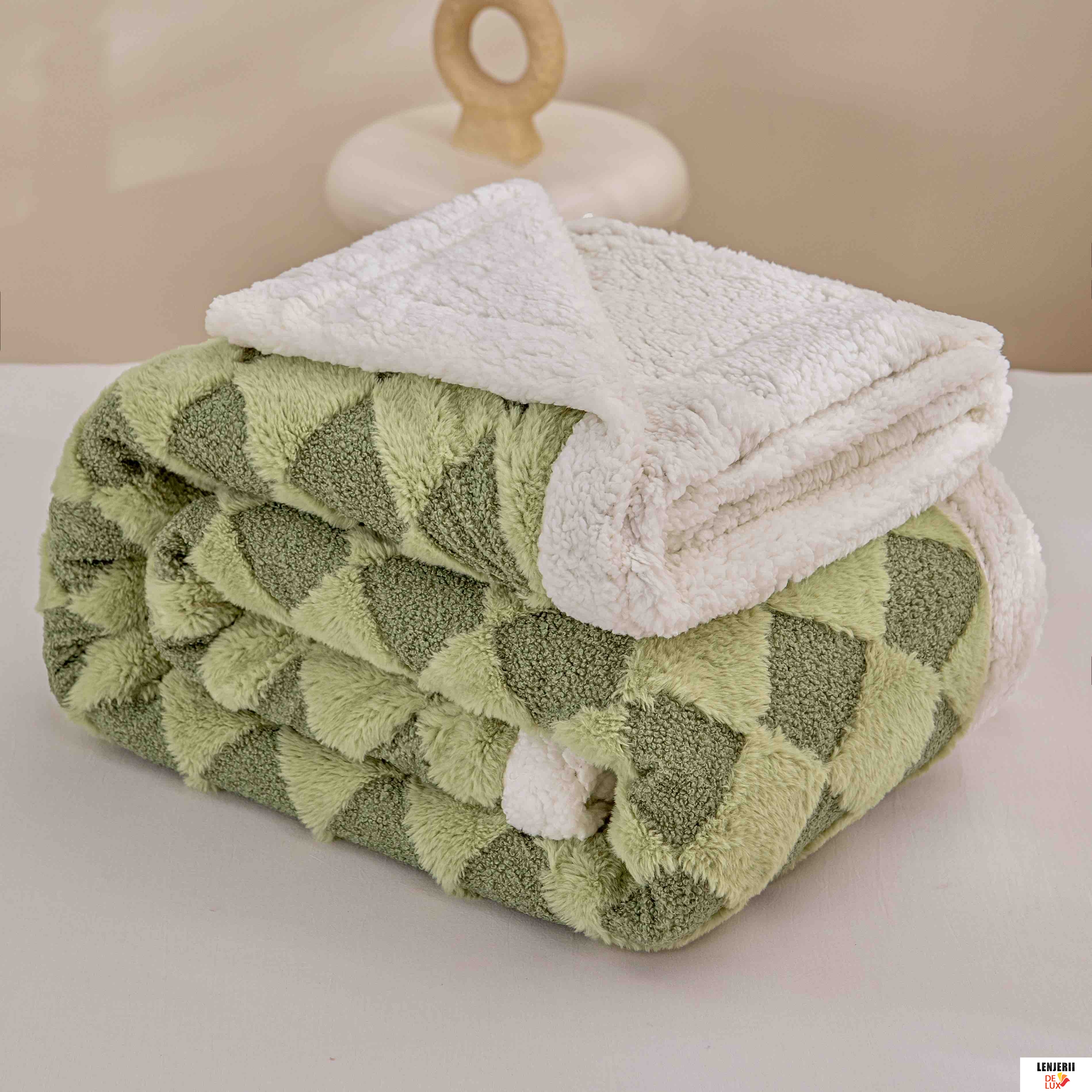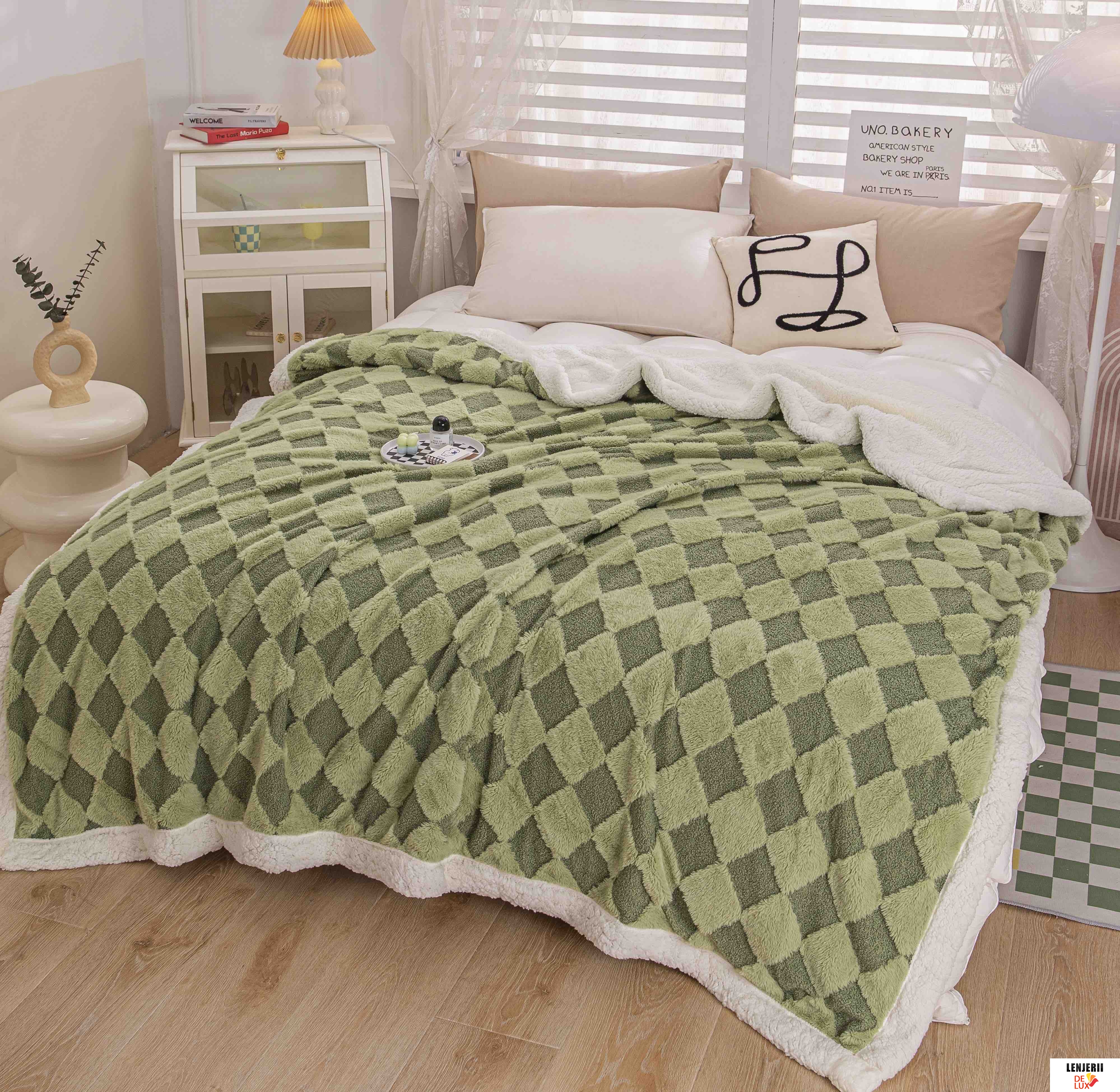 Prezentare Patura Cocolino din catifea Teddy verde cu blanita artificiala de iepure