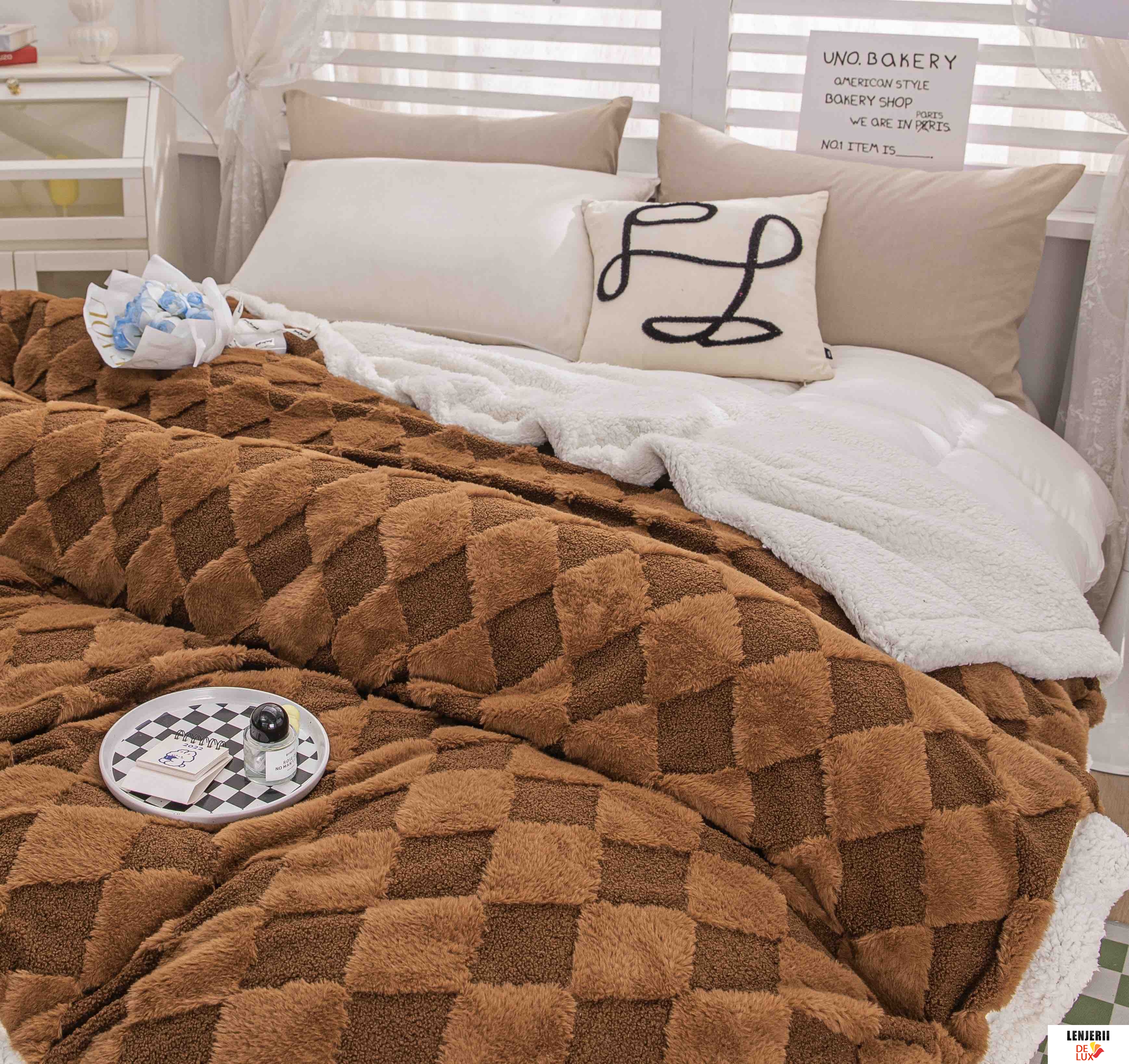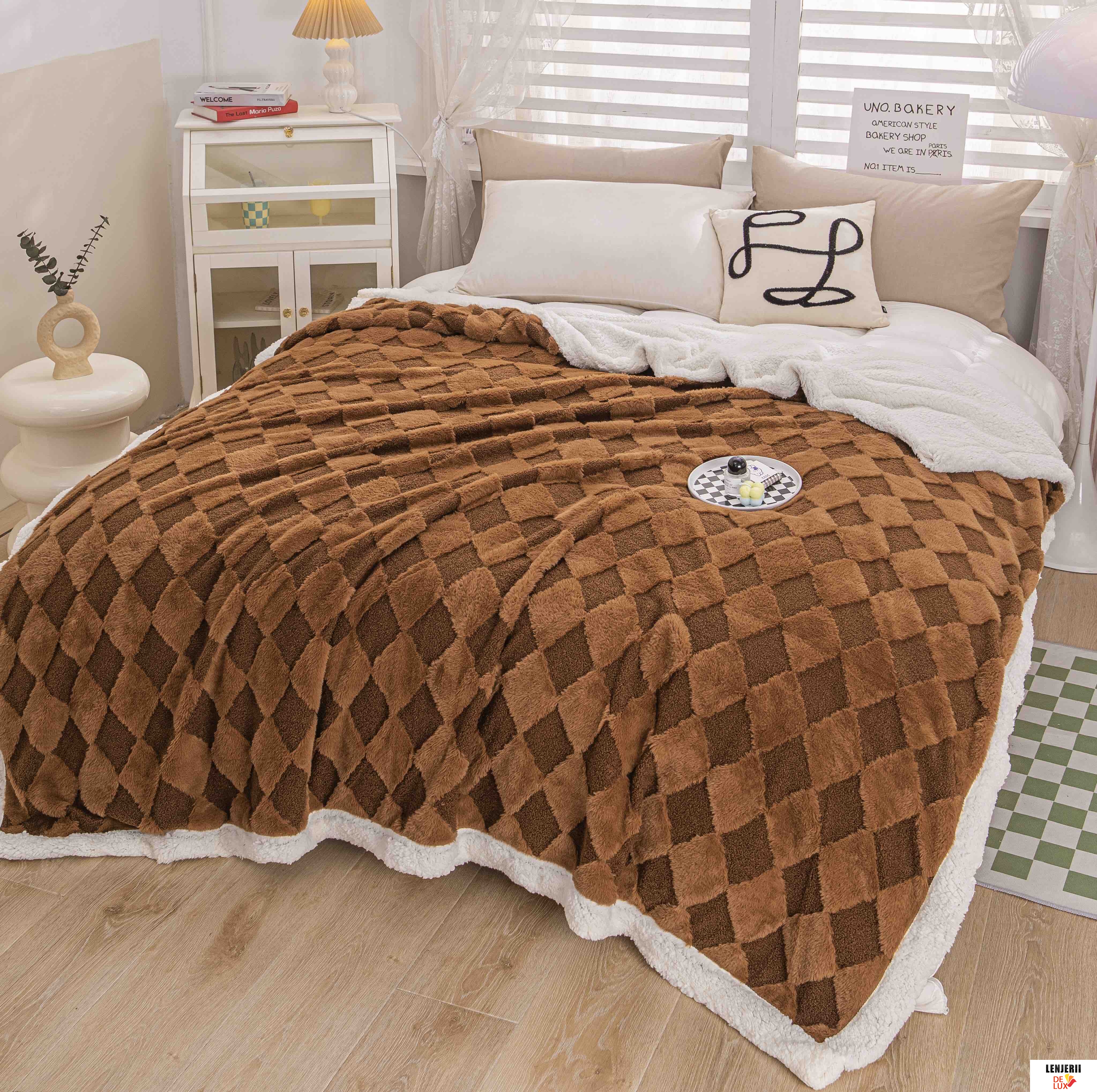 Prezentare Patura Cocolino maro din catifea Teddy cu blanita artificiala de iepure