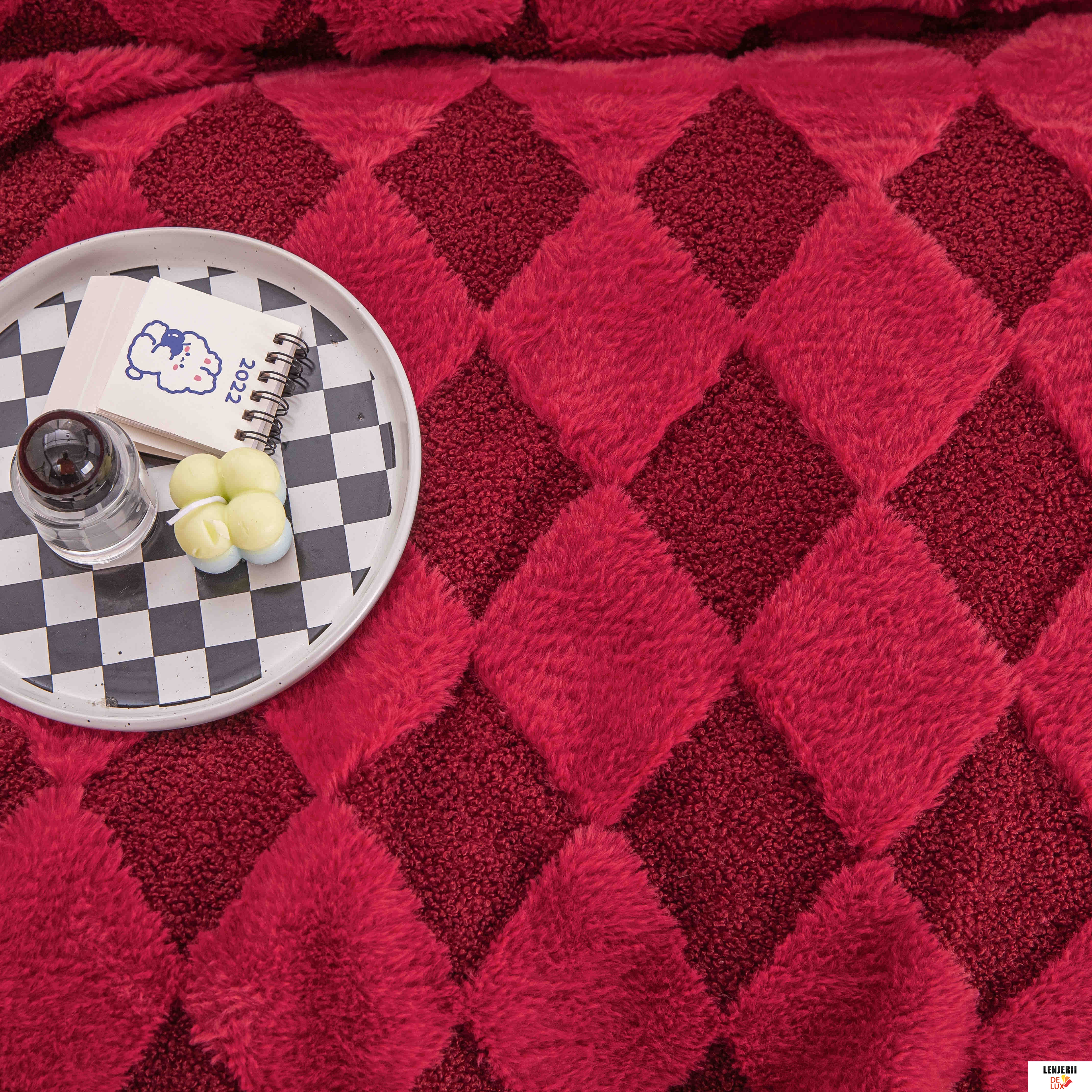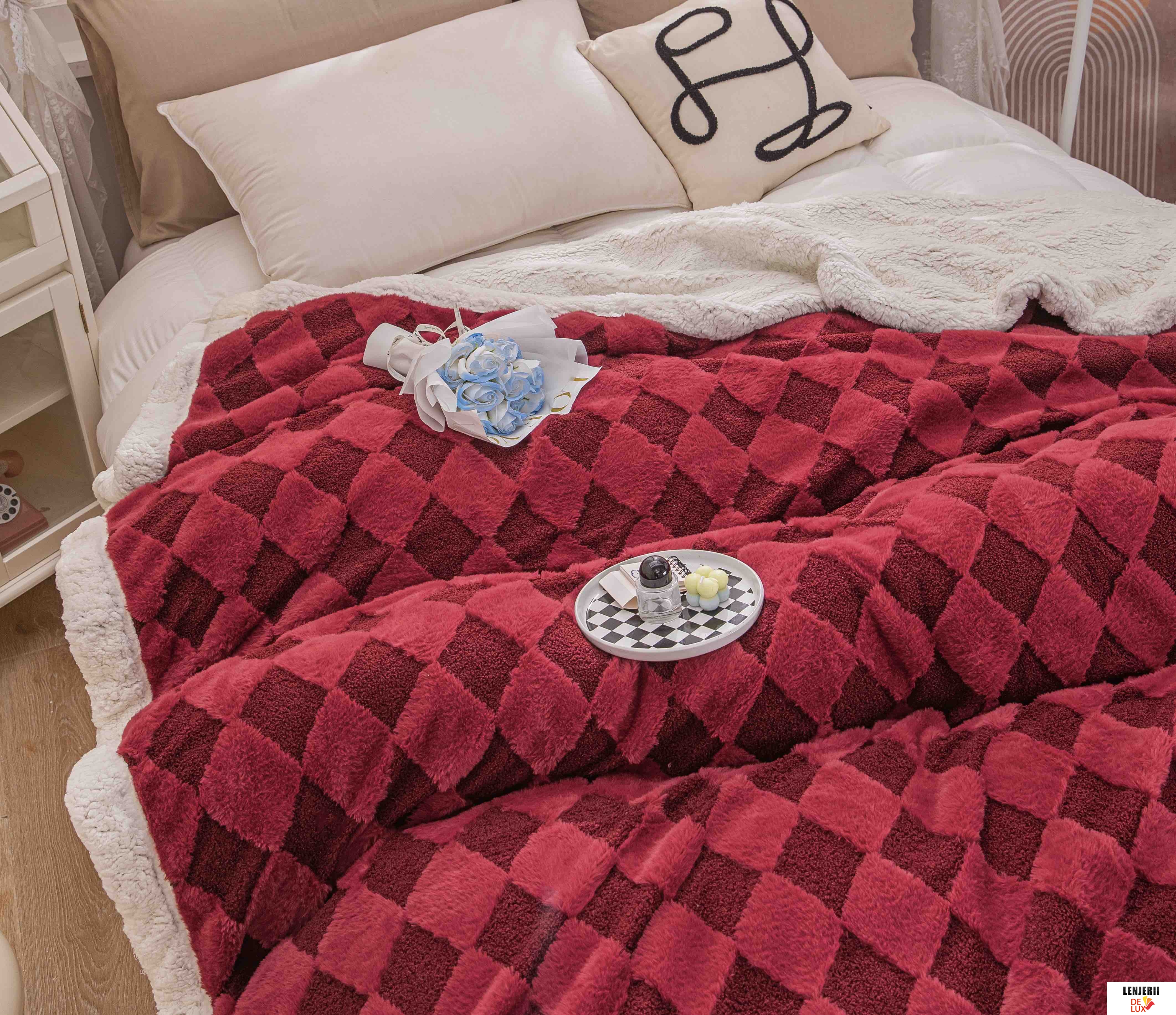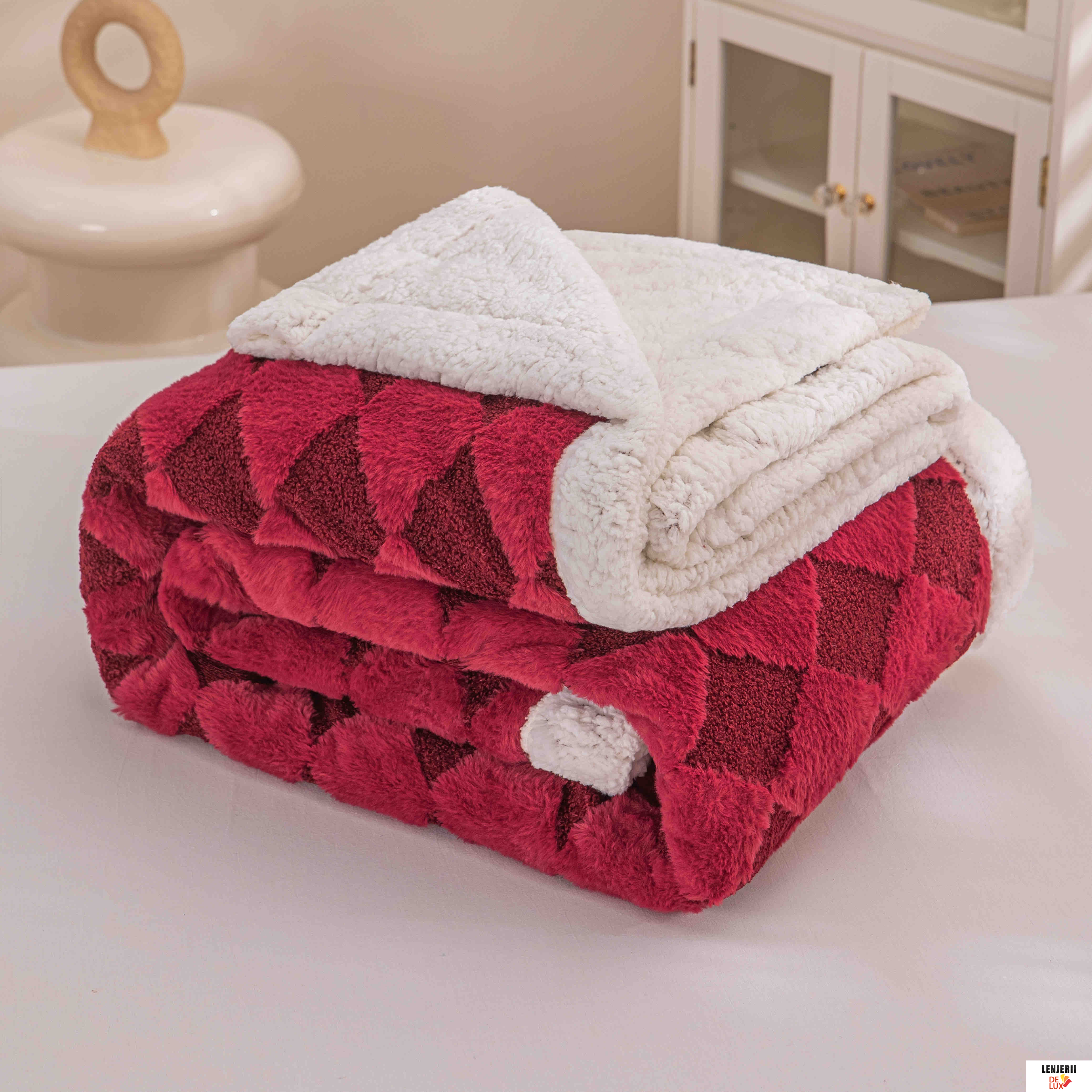 Prezentare Patura Cocolino rosie din catifea Teddy cu blanita artificiala de iepure