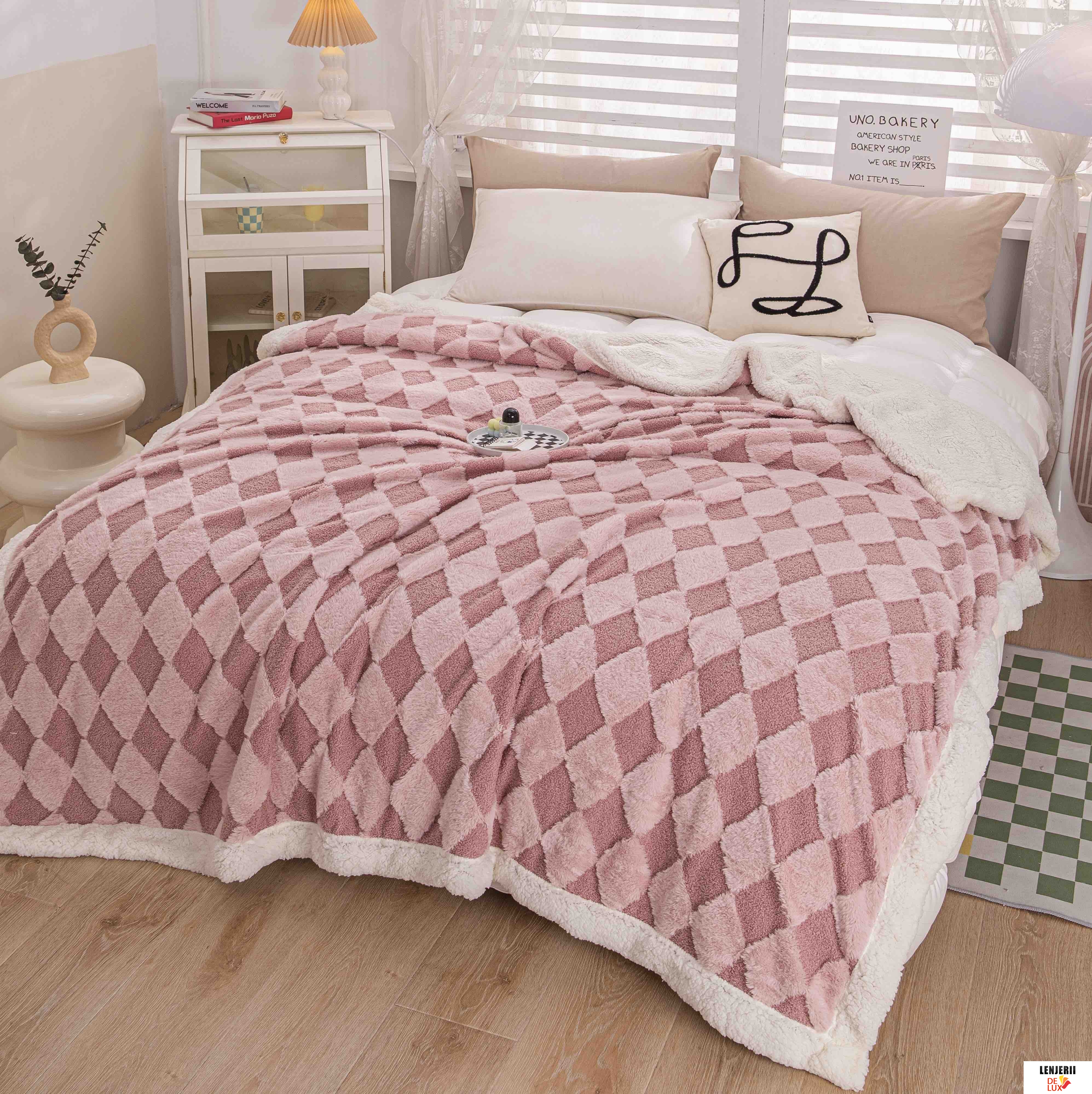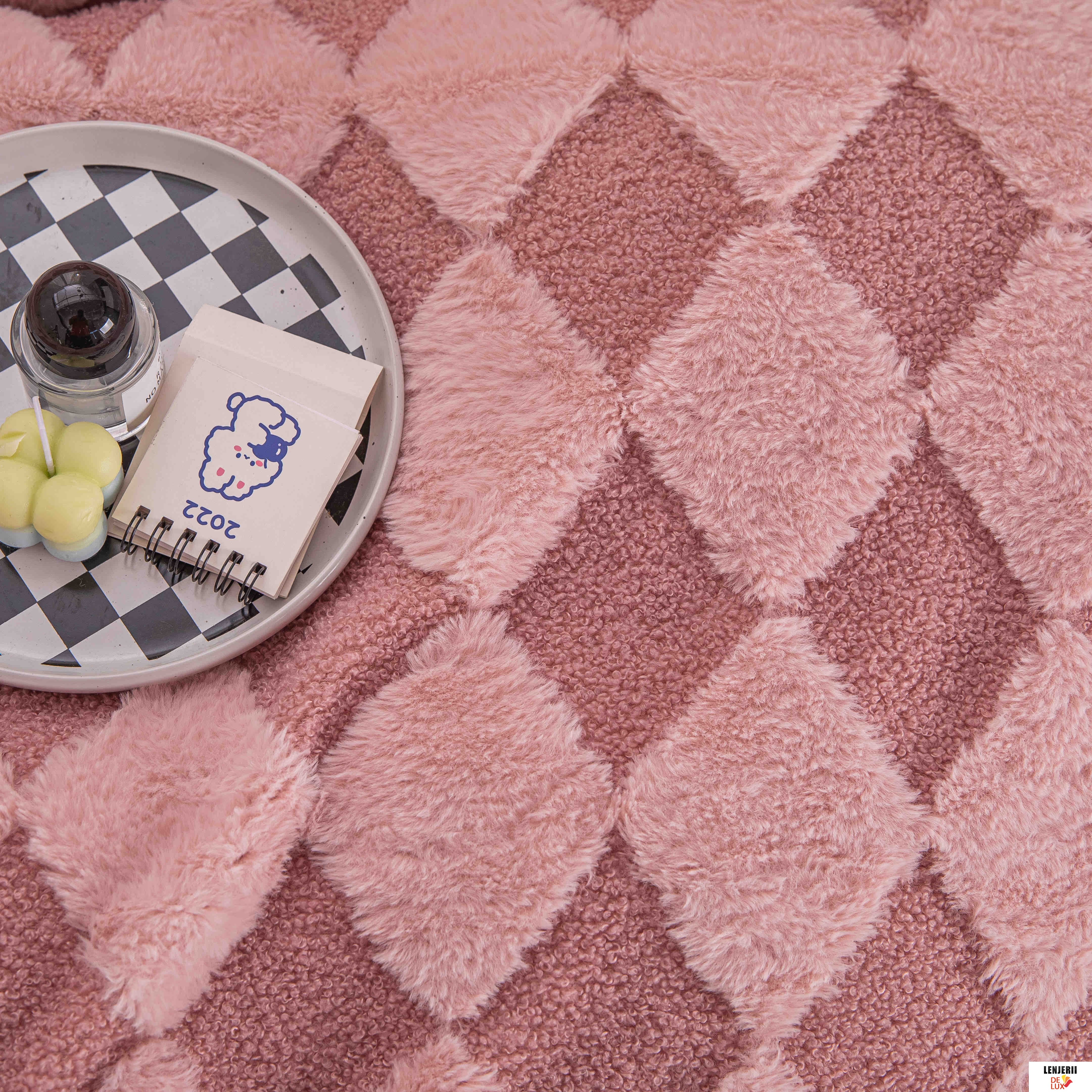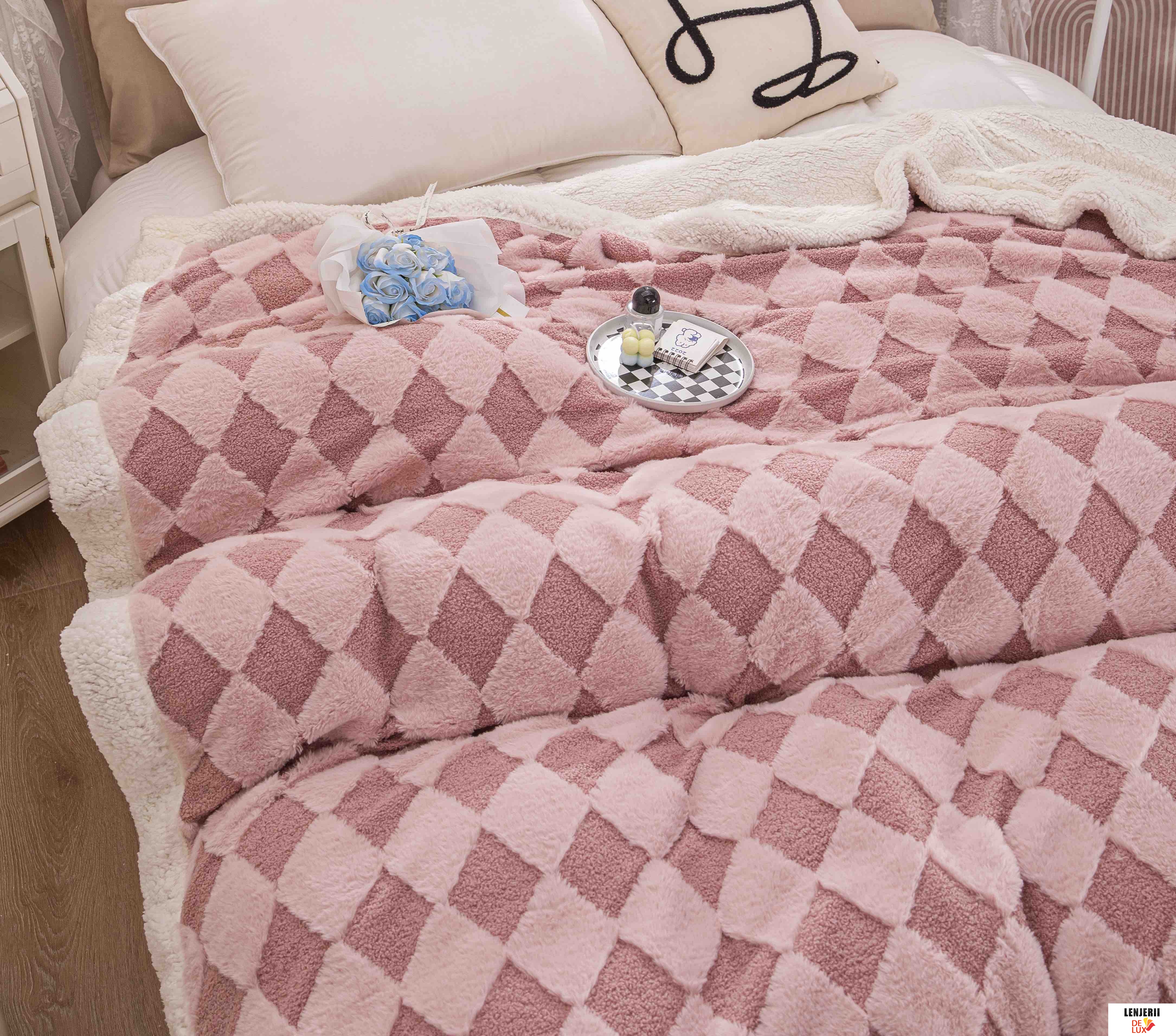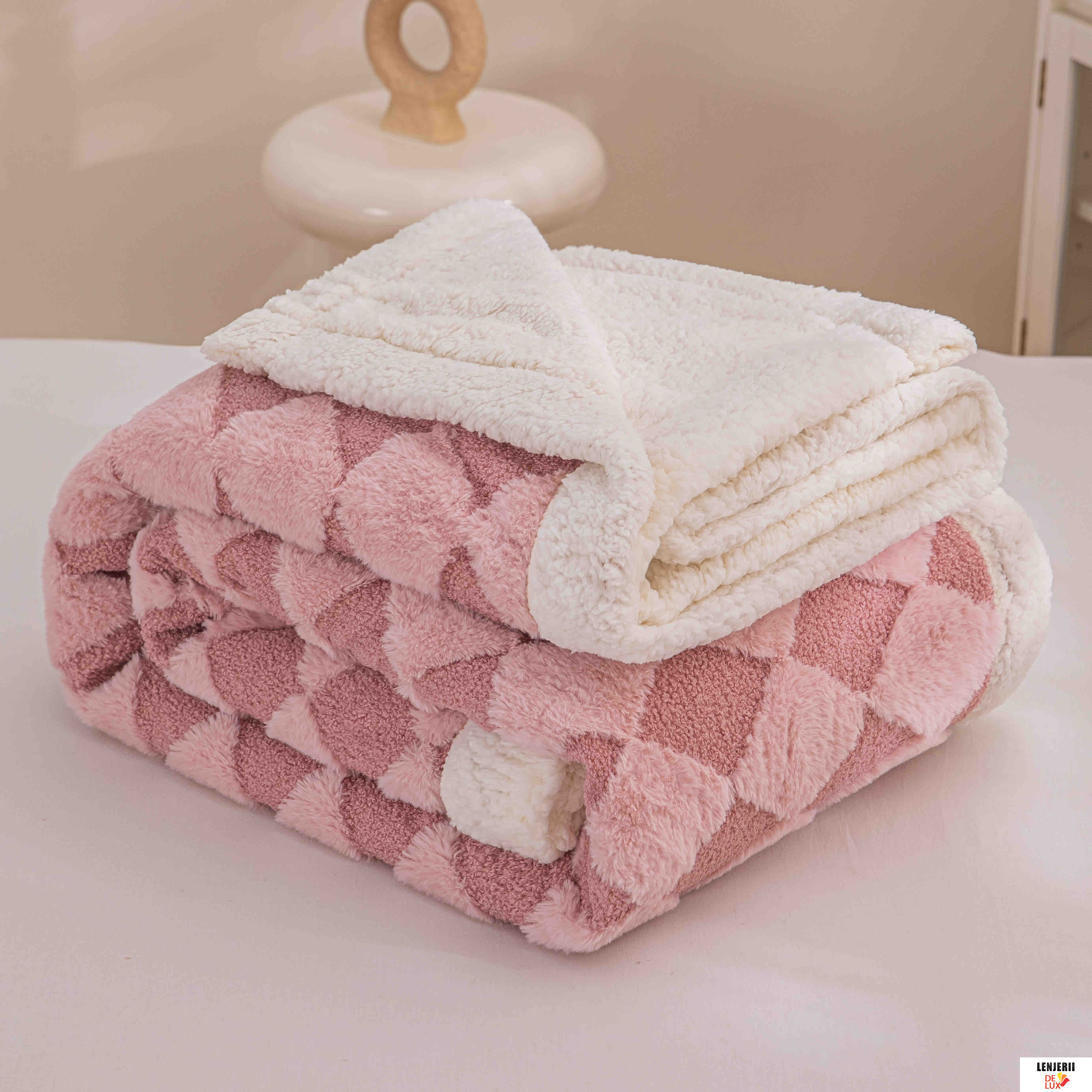 Prezentare Patura Cocolino roz din catifea Teddy cu blanita artificiala de iepure