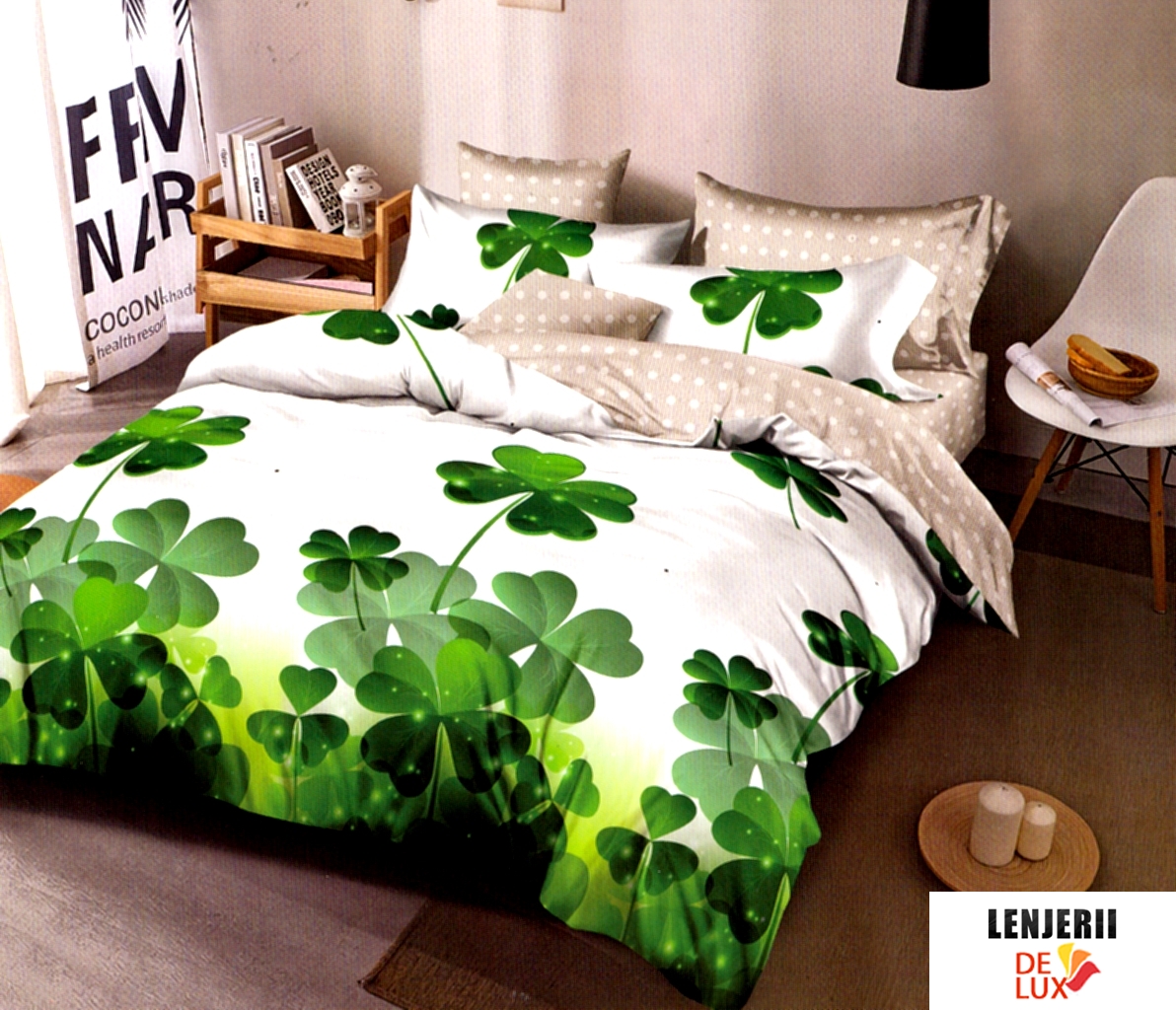 PILOTA+2 PERNE+Lenjerie de pat alba, imprimeu trifoi cu 4 foi Pucioasa formata din 6 piese