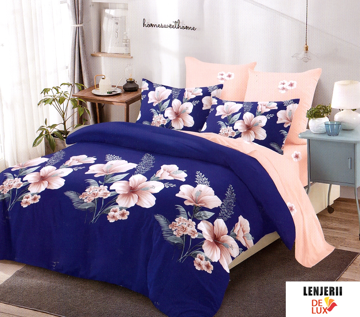 Prezentare PILOTA+2 PERNE+Lenjerie de pat albastra cu flori din finet formata din 6 piese