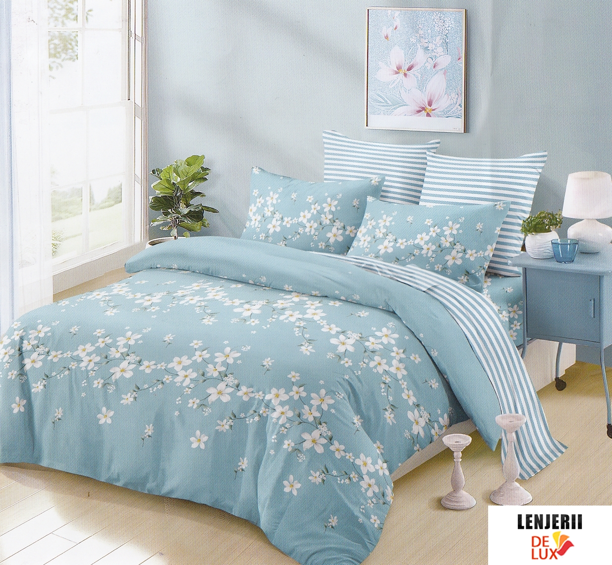Prezentare PILOTA+2 PERNE+Lenjerie de pat albastra cu imprimeuri din finet formata din 6 piese