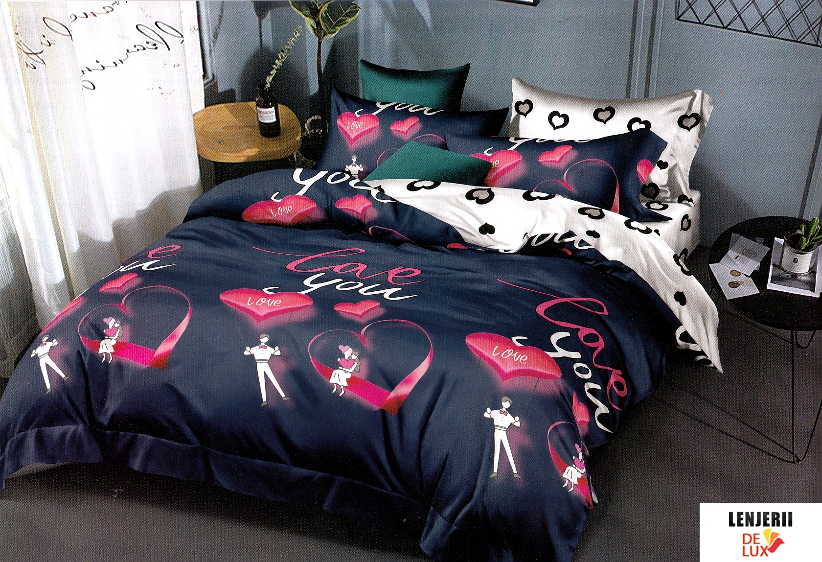 PILOTA+2 PERNE+ Lenjerie de pat albastra cu inimioare roz din finet formata din 6 piese